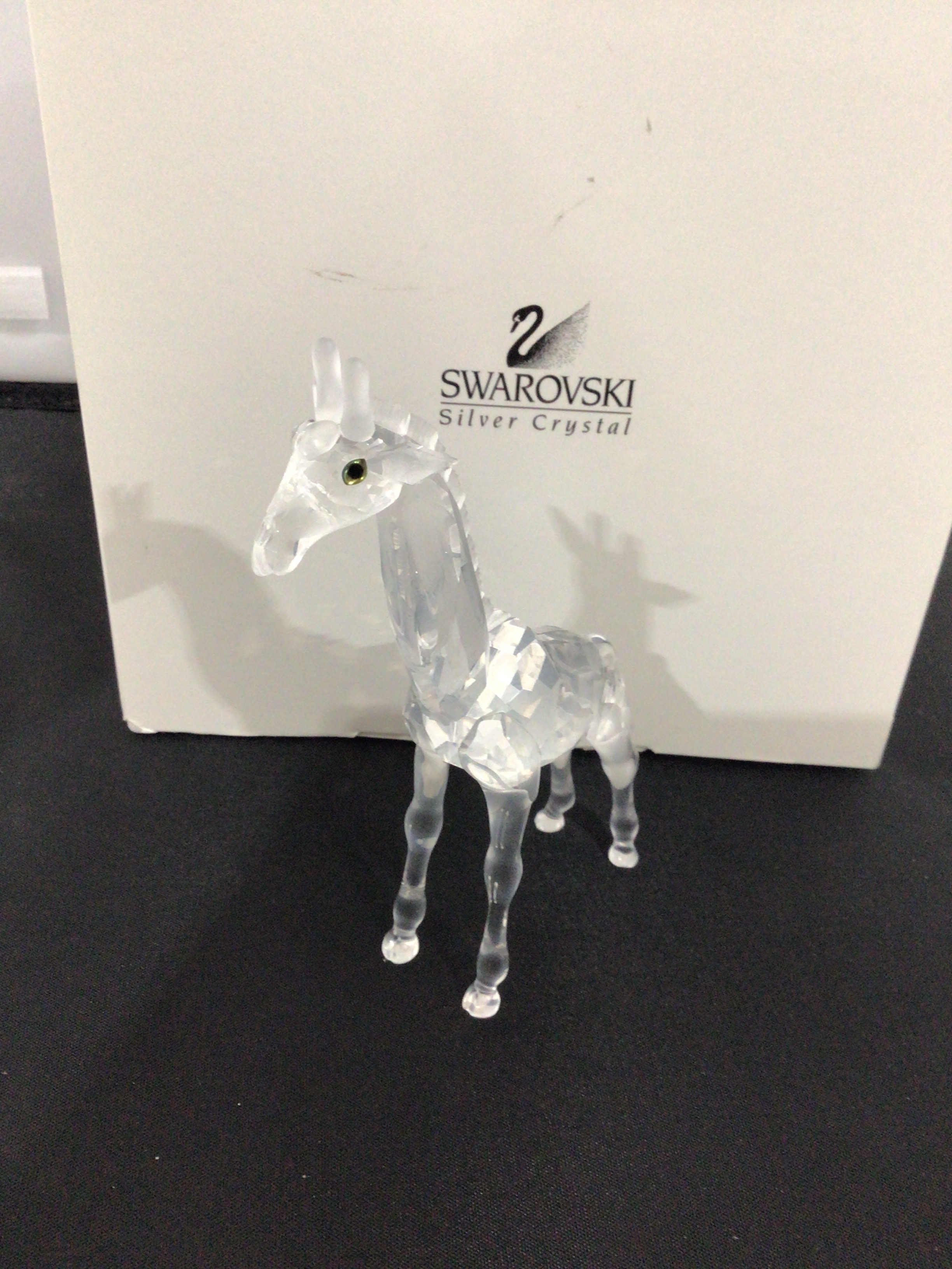 A Swarovski ‘Baby Giraffe’ crystal figurine. The contemporary clear faceted crystal figurine depicts a stylized giraffe, featuring a largely transparent body with distinct angular cuts and small green accents for eyes. It stands against a white background which displays the ‘SWAROVSKI Silver Crystal’ logo, including a swan emblem, indicating the manufacturer and material.