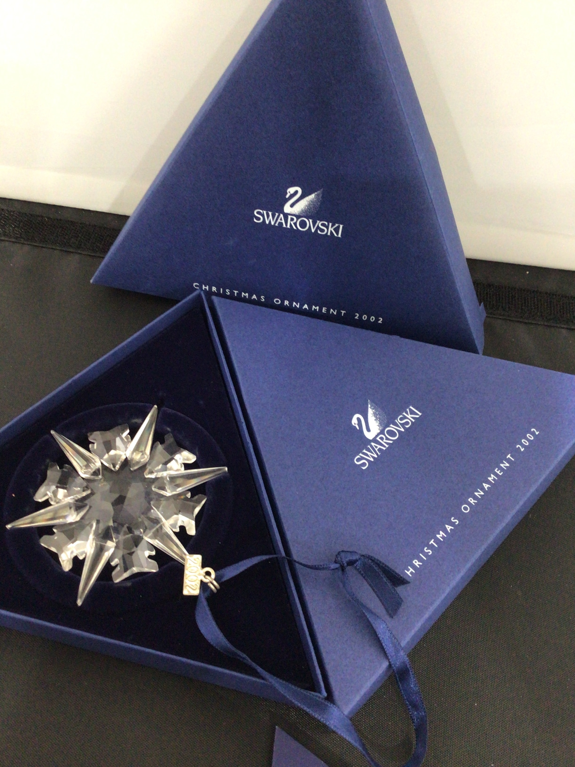 A Swarovski Christmas Ornament from the 2002 annual edition. This faceted clear crystal ornament is designed in a multi-pointed snowflake or starburst form, featuring numerous reflective facets. It includes a small gold-toned metal tag attached near the suspension loop, from which a dark blue ribbon extends. The ornament is presented within its original dark blue triangular box packaging, which prominently displays the “SWAROVSKI” brand name, iconic swan logo, and the text “CHRISTMAS ORNAMENT 2002”.