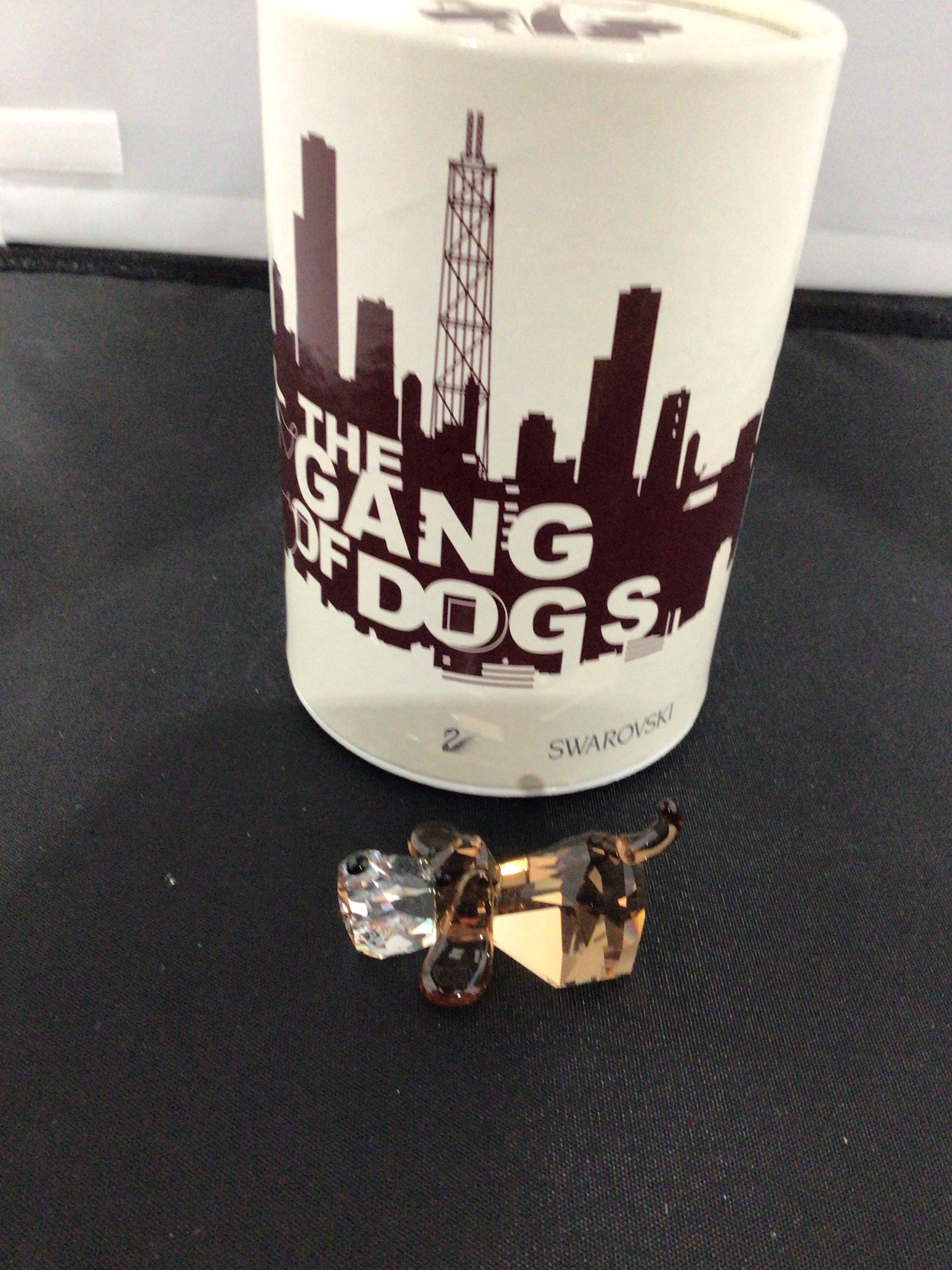 A Swarovski LOVLOTS ‘Peppino’ Basset Hound crystal figurine. The figurine depicts a dog with an elongated body, featuring clear faceted crystal for the head and amber-toned faceted crystal for the body and legs. It is accompanied by its original cylindrical white cardboard container, which is adorned with a brown silhouette graphic of a city skyline. The container is printed with ‘THE GANG OF DOGS’ above the skyline and ‘SWAROVSKI’ below the graphic.