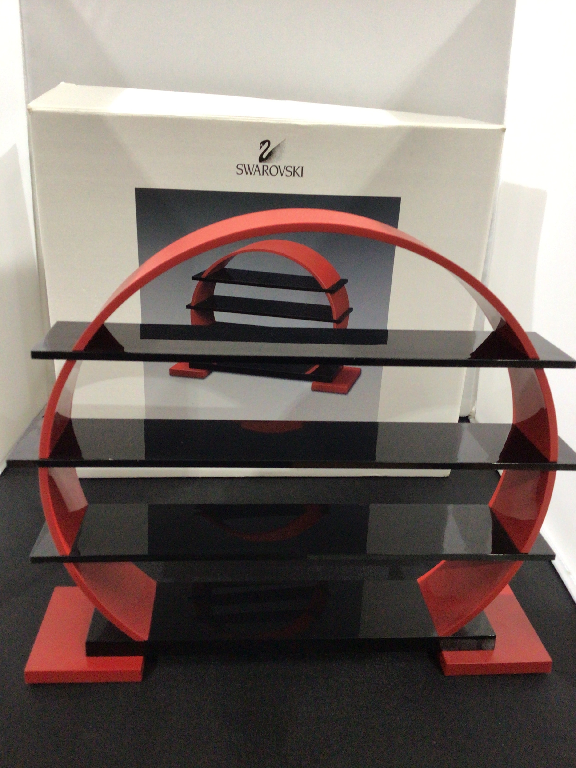 A Swarovski Chinese Zodiac Display Stand, featuring a striking geometric design. The stand comprises a prominent red arched frame, appearing to be lacquered wood or a similar composite material, which supports three black, rectangular shelves. The shelves are likely black glass or polished acrylic. The item is accompanied by its original white packaging box, which displays the distinctive Swarovski swan logo and ‘SWAROVSKI’ text, and illustrates a smaller version of the same display unit on its front.