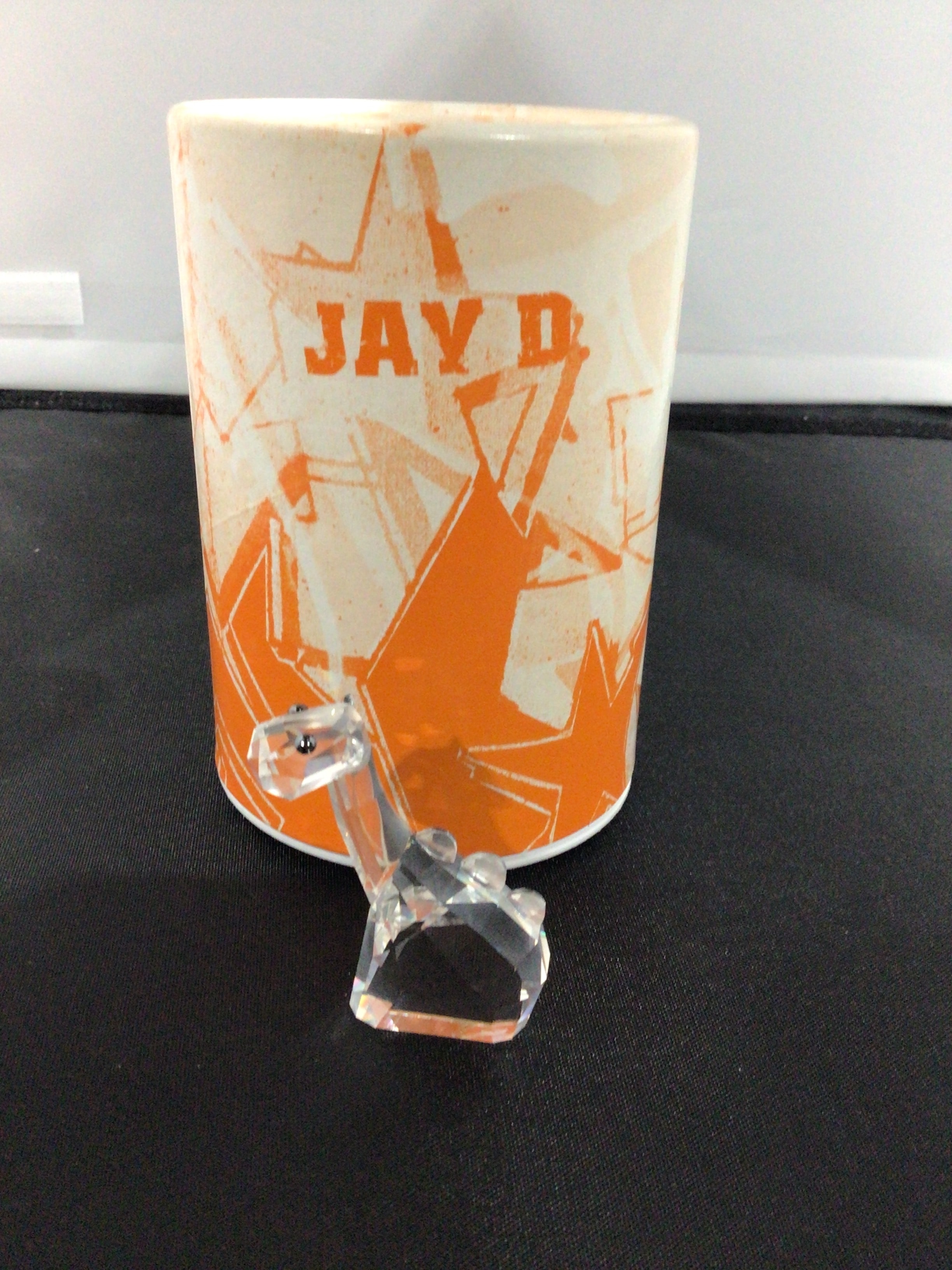 A Swarovski Crystal Lovlots ‘Jay D Dino’ Dinosaur Figurine, dating to 2006 from ‘The Lovlots Collection’. The clear, faceted crystal figurine depicts a stylized dinosaur or dragon. Accompanying this is a cylindrical white ceramic mug featuring an orange graphic design of abstract shapes and stylized stars, with the prominent text ‘JAY D’ printed in orange capital letters.