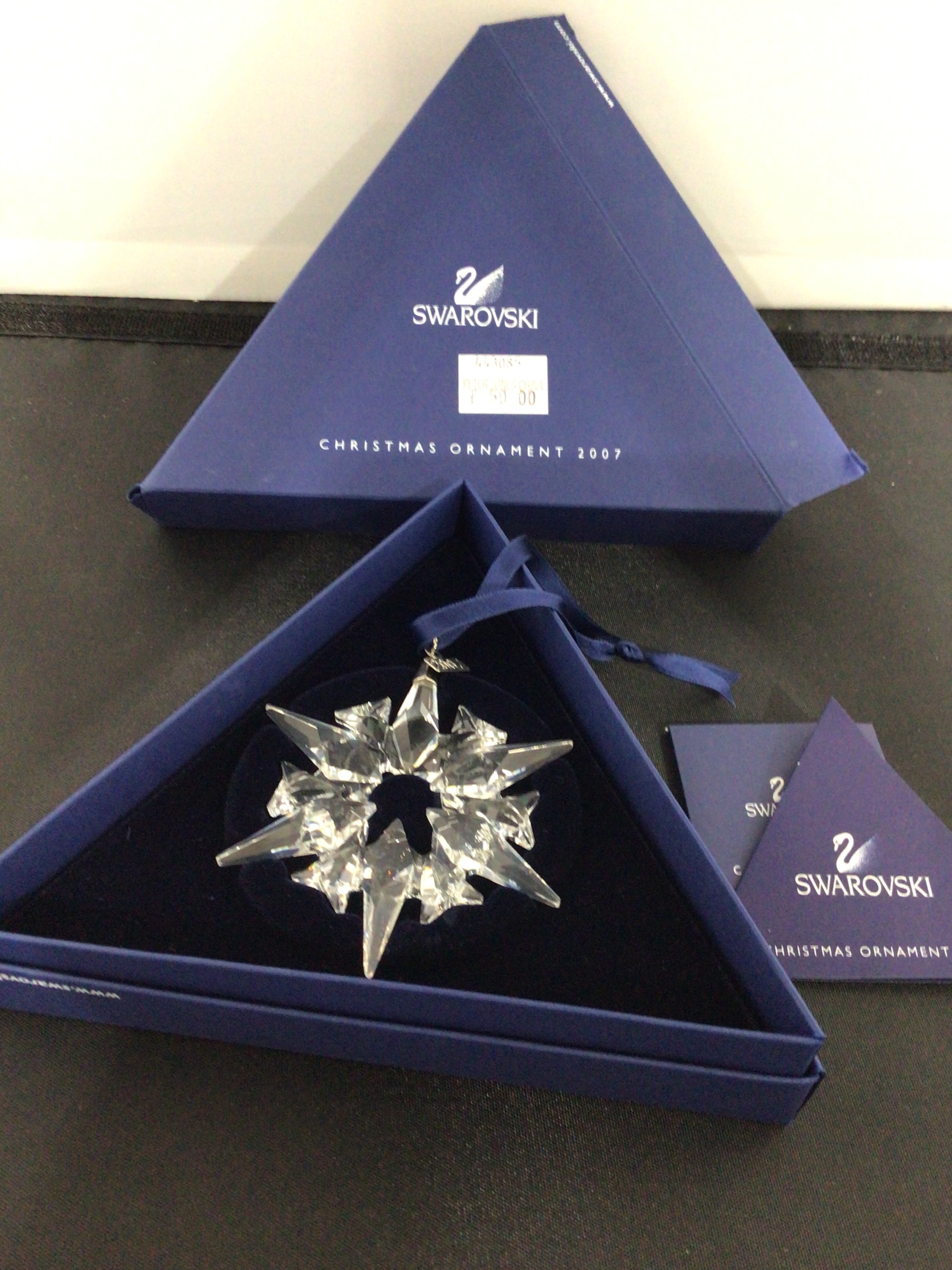 A Swarovski Annual Edition 2007 Christmas Ornament. This lot comprises a clear, faceted crystal design resembling a starburst or snowflake, with an attached blue hanging ribbon. It is presented in its original dark blue triangular box, lined with a dark blue velvet-like material, and marked with the Swarovski swan logo, “SWAROVSKI,” and “CHRISTMAS ORNAMENT 2007.” A partially visible sticker on the box shows product number “643085” and a price of “60.00.” A website address “www.swarovski.com” is visible on the box edge. Also included are accompanying small triangular cards bearing the same branding and text.