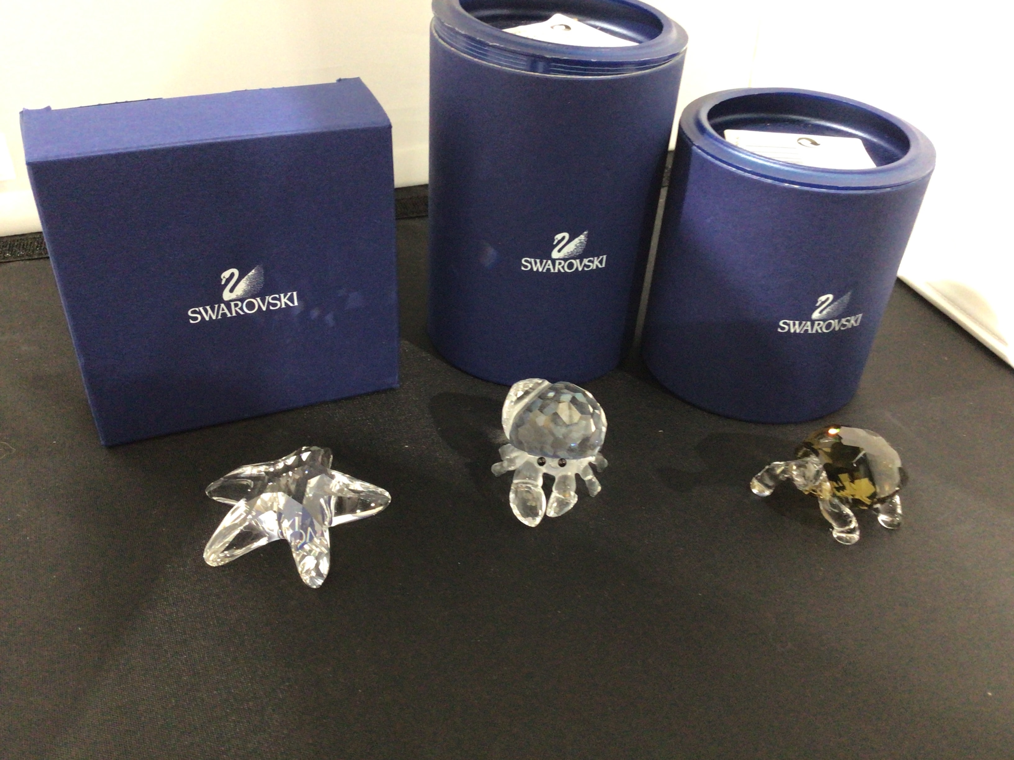 Three Swarovski crystal animal figurines, comprising a clear faceted starfish, a clear faceted octopus with small dark eyes, and an amber faceted turtle. The figurines are presented with their original deep blue packaging, consisting of one rectangular box and two cylindrical containers, all clearly marked “SWAROVSKI” alongside the brand’s swan logo in white.