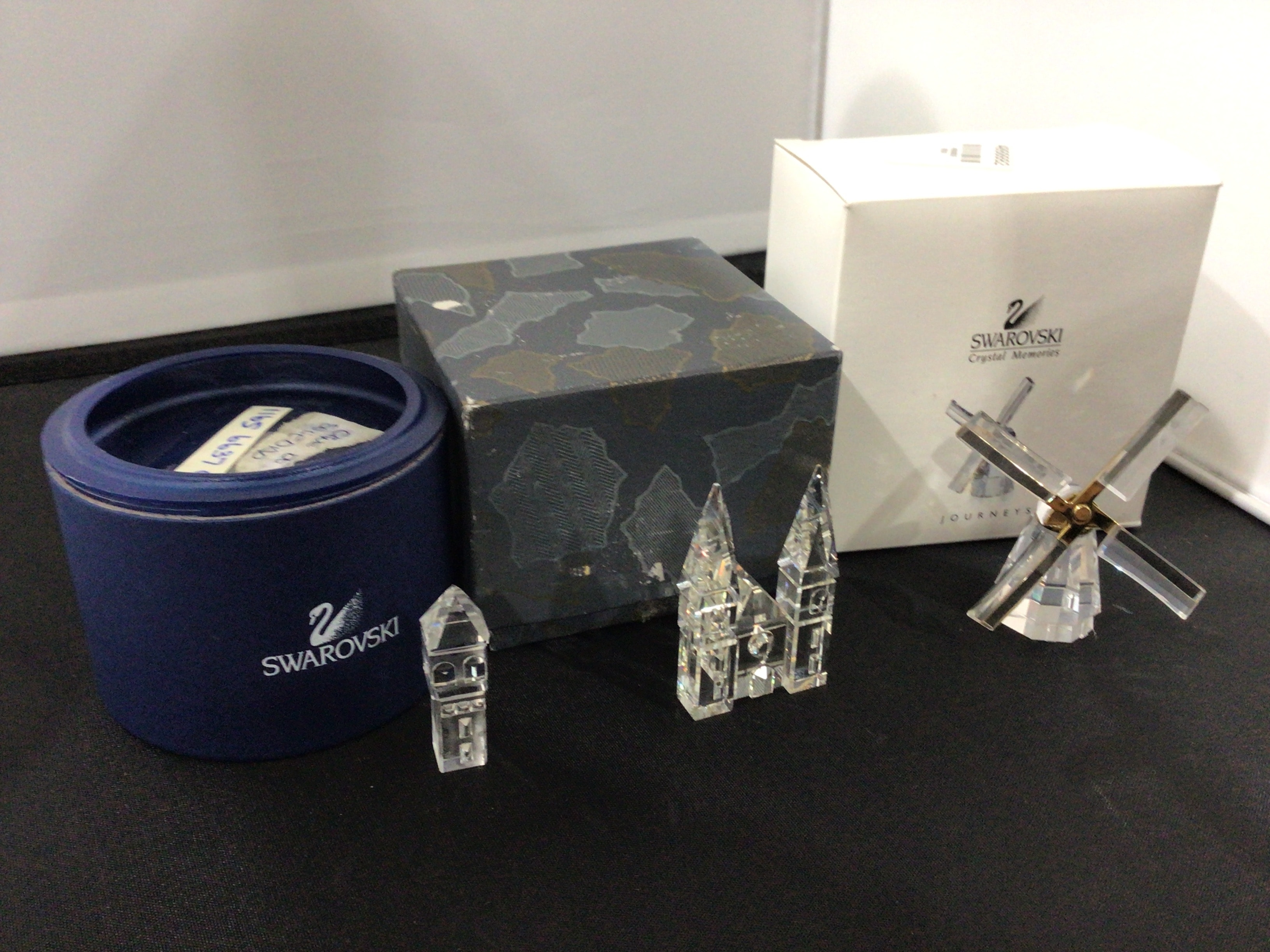 A collection of Swarovski Crystal Memories ‘Journeys’ faceted crystal figurines. Comprising one windmill with gold-toned metal accents and four architectural elements resembling buildings or spires. The items are accompanied by their original packaging, including a white cardboard box labeled ‘SWAROVSKI Crystal Memories’ and ‘JOURNEYS’ with the brand’s swan logo, a dark blue cylindrical fabric-covered box also marked ‘SWAROVSKI’ with its swan logo, and a dark grey patterned cardboard box. A white label with ‘L899 5911’ is visible within the blue box.