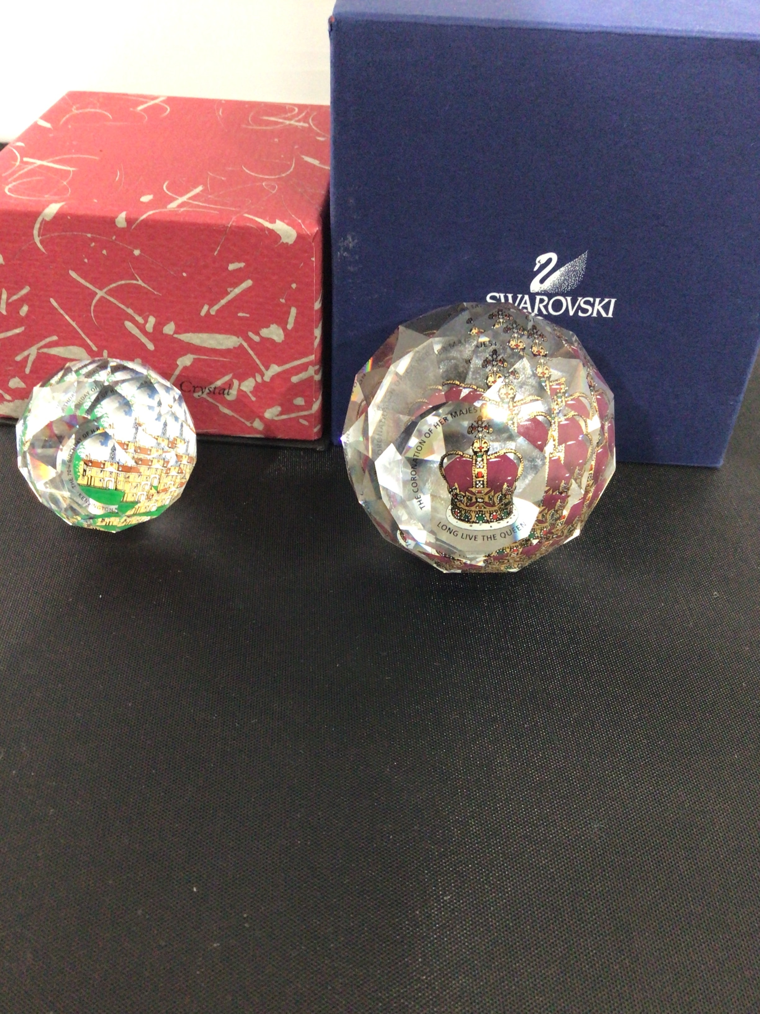 A pair of Swarovski crystal paperweights. The larger ornament features an internal design of a purple and gold crown with ornate gold and red detailing, encircled by the inscriptions “THE CORONATION OF HER MAJESTY” and “LONG LIVE THE QUEEN.” The smaller ornament contains an internal image of a yellow and brown building, possibly a royal residence, surrounded by the text “THE 70TH BIRTHDAY OF HER MAJESTY THE QUEEN.” Accompanied by their original packaging, including a deep blue box with the “SWAROVSKI” swan logo and brand name, and a red decorative box with white patterns, partially revealing the word “CRYSTAL.”