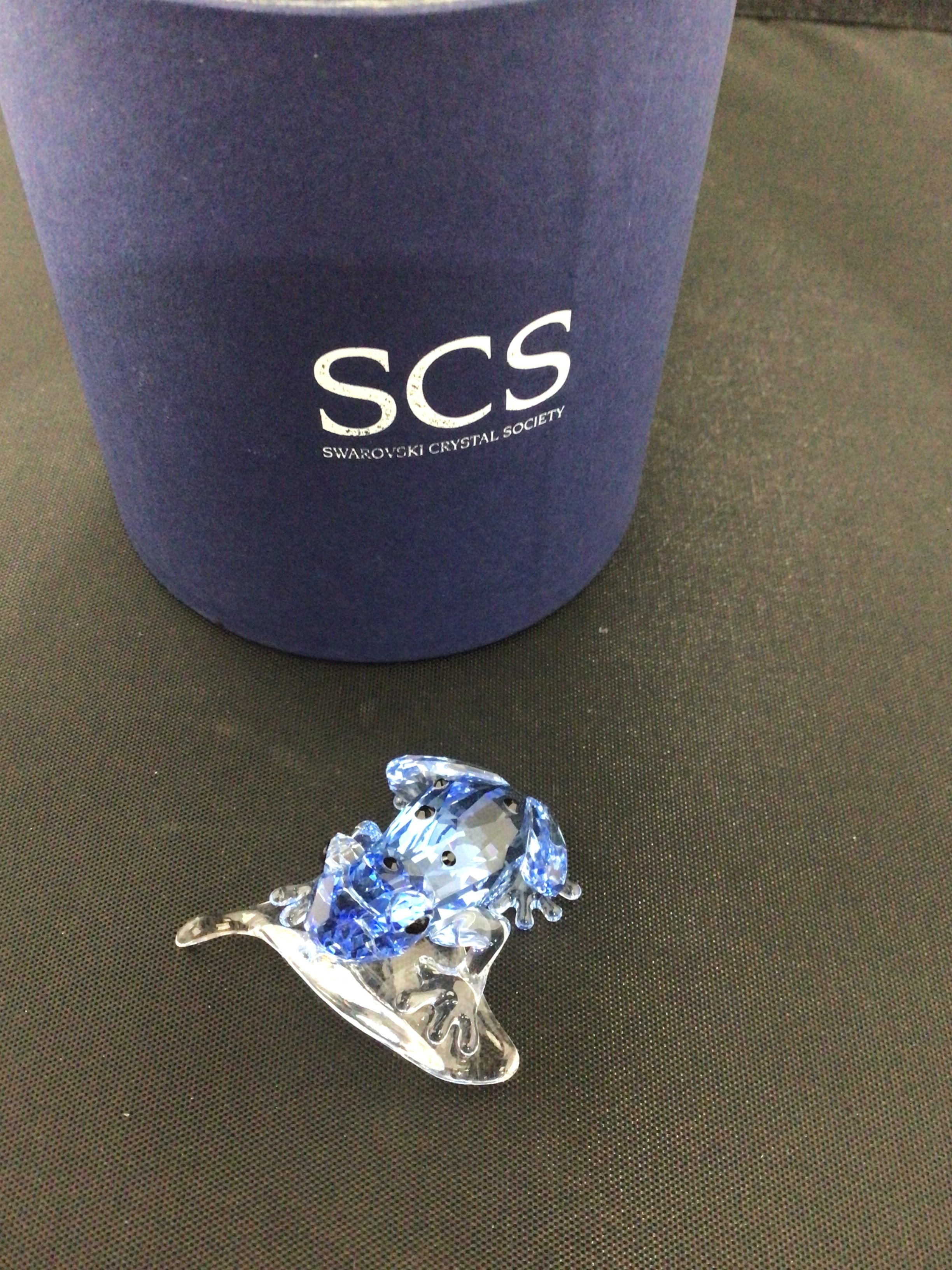 A Swarovski SCS crystal frog figurine. Crafted from clear and varying shades of blue faceted crystal with small black accents, depicting a frog resting on a clear, organic-shaped base. Accompanied by its original dark blue cylindrical box, felt-covered, emblazoned with ‘SCS’ and ‘SWAROVSKI CRYSTAL SOCIETY’ in white text.