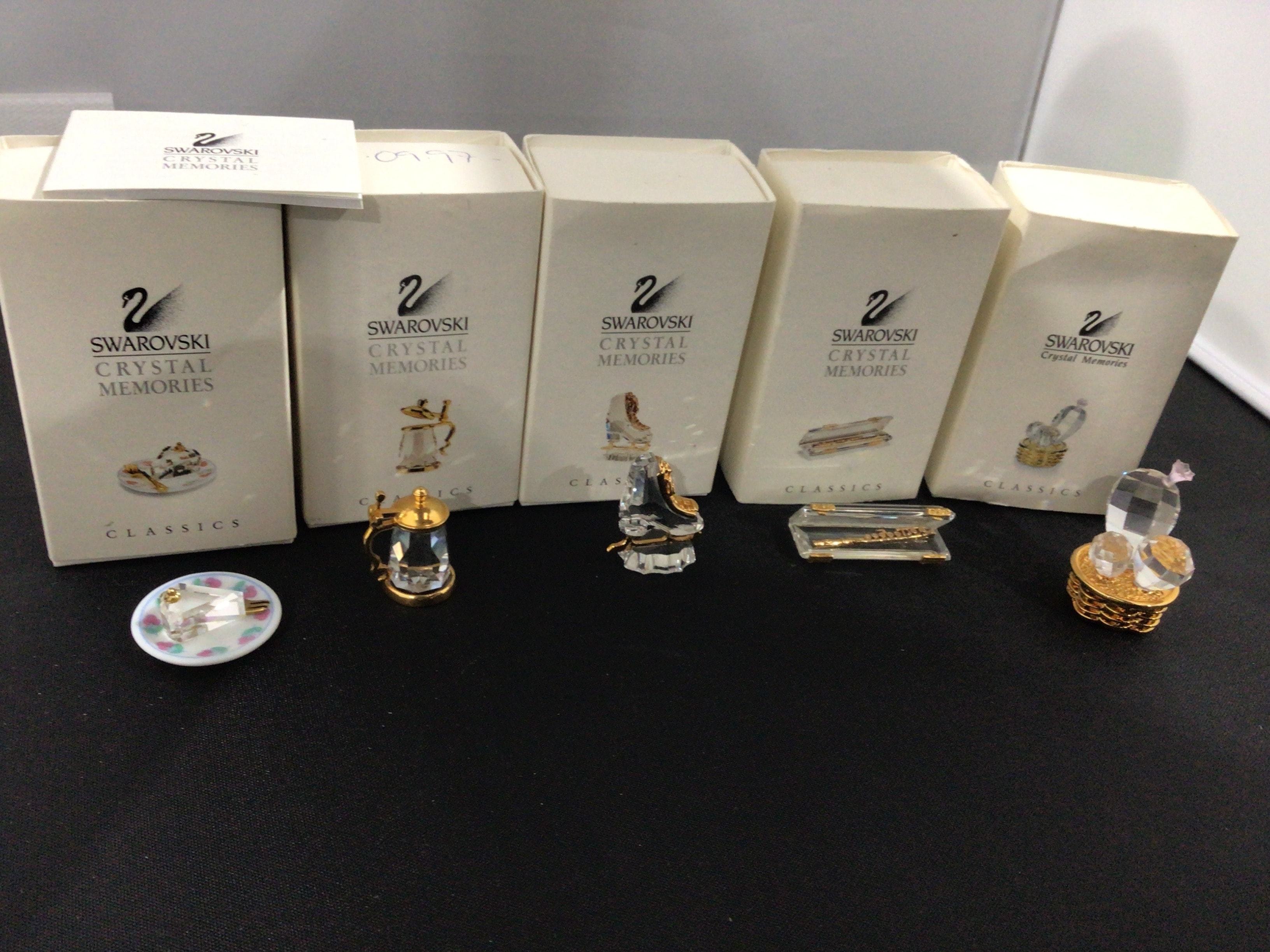 A collection of Swarovski Crystal Memories figurines, comprising five boxed and one unboxed collectible figurines, predominantly clear faceted crystal with gold-tone metal accents. The unboxed figures include a miniature beer stein, a saxophone or flute in a case, a cactus in a pot, and a delicate plate with what appears to be a slice of cake. The boxes are labeled ‘SWAROVSKI CRYSTAL MEMORIES CLASSICS’ and feature the brand’s iconic swan logo, with one box additionally marked ‘0997’ by hand. Specific models identified through web intelligence include a Beer Stein (similar to 173369 / 9460) and a Flute.