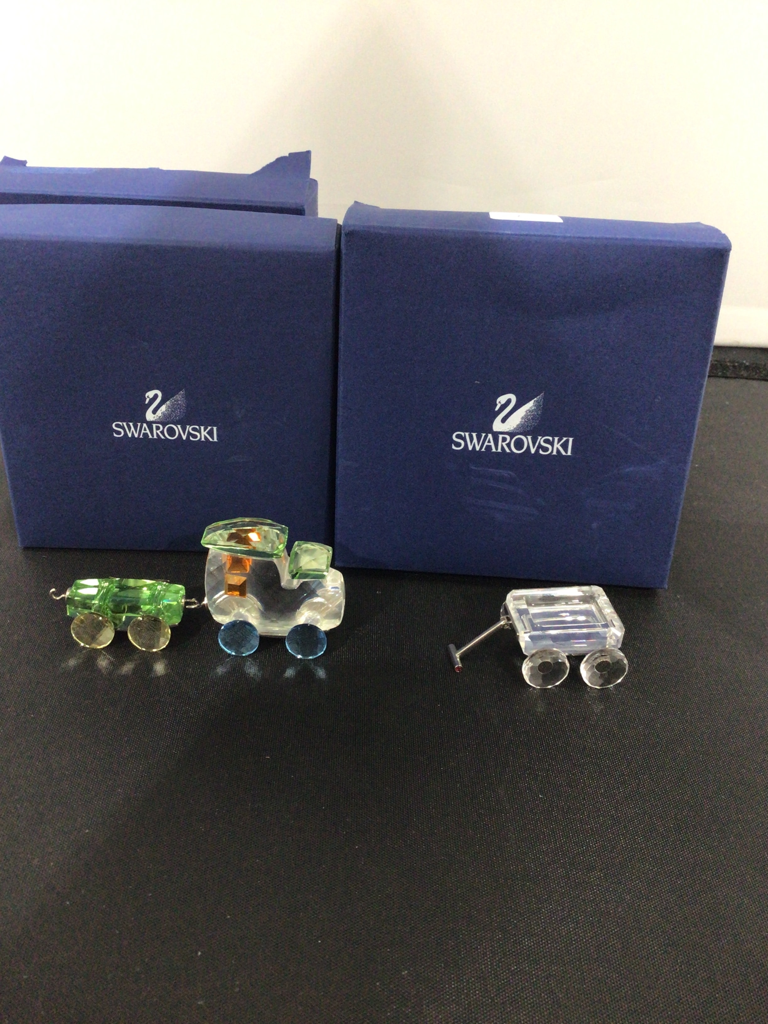 A set of three Swarovski crystal train figurines. The lot comprises a clear crystal locomotive with green and amber accents and blue crystal wheels, a green crystal wagon with yellow crystal wheels and a metal coupling hook, and a clear crystal trailer with clear crystal wheels and a metal hitch featuring a red tip. These figurines are accompanied by two dark blue cardboard boxes, both prominently displaying the “SWAROVSKI” brand name and swan logo in white.