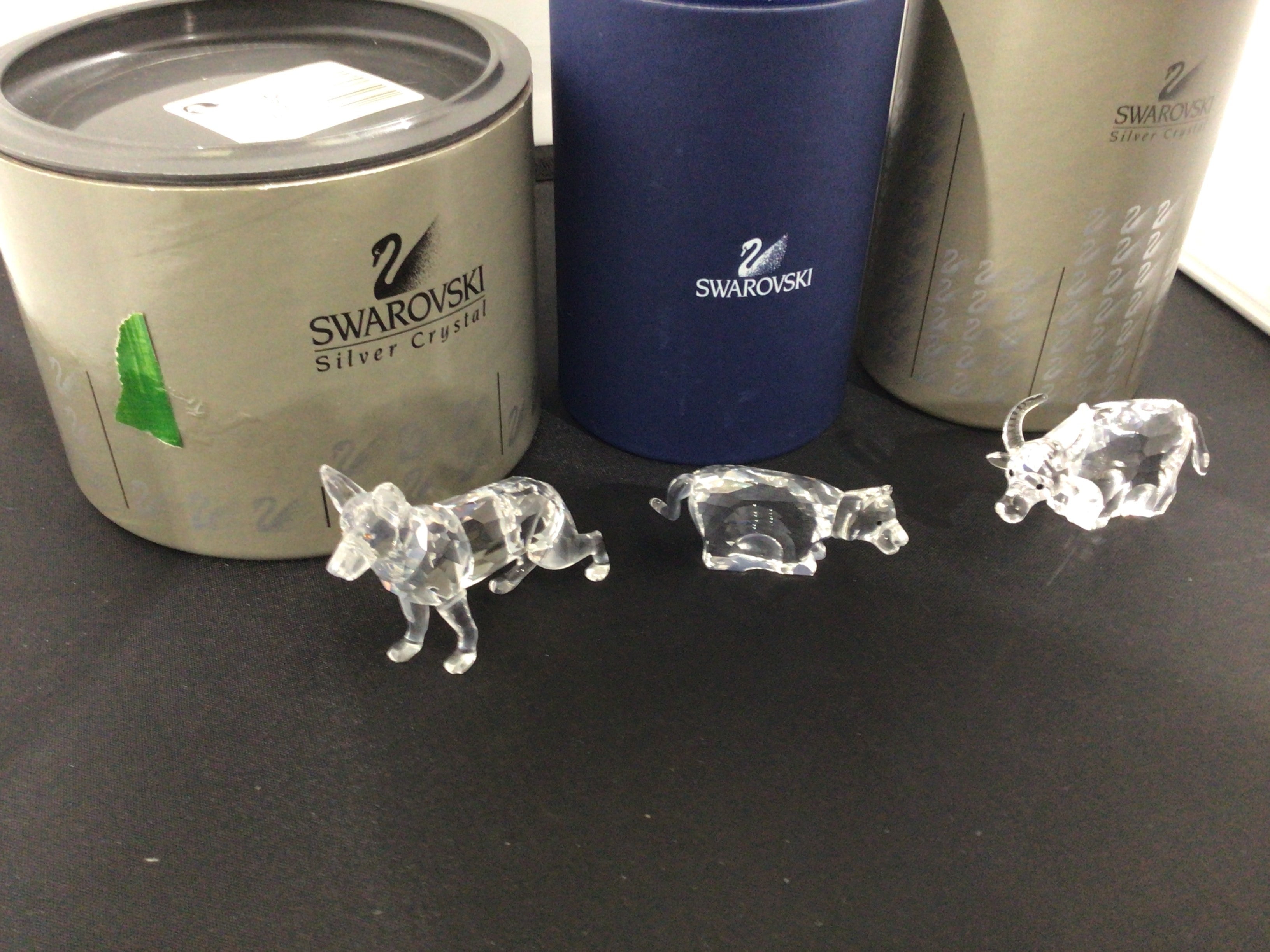 A group of three faceted clear crystal animal figurines by Swarovski. Comprising a dog-like figure, a bear, and a bull or ox. Each figurine is crafted from clear faceted crystal. Accompanied by three cylindrical branded packaging boxes: two in light grey/tan and one in dark blue. All packaging is marked with the ‘SWAROVSKI’ brand name and its iconic swan logo; the grey/tan boxes additionally feature the text ‘Silver Crystal’.
