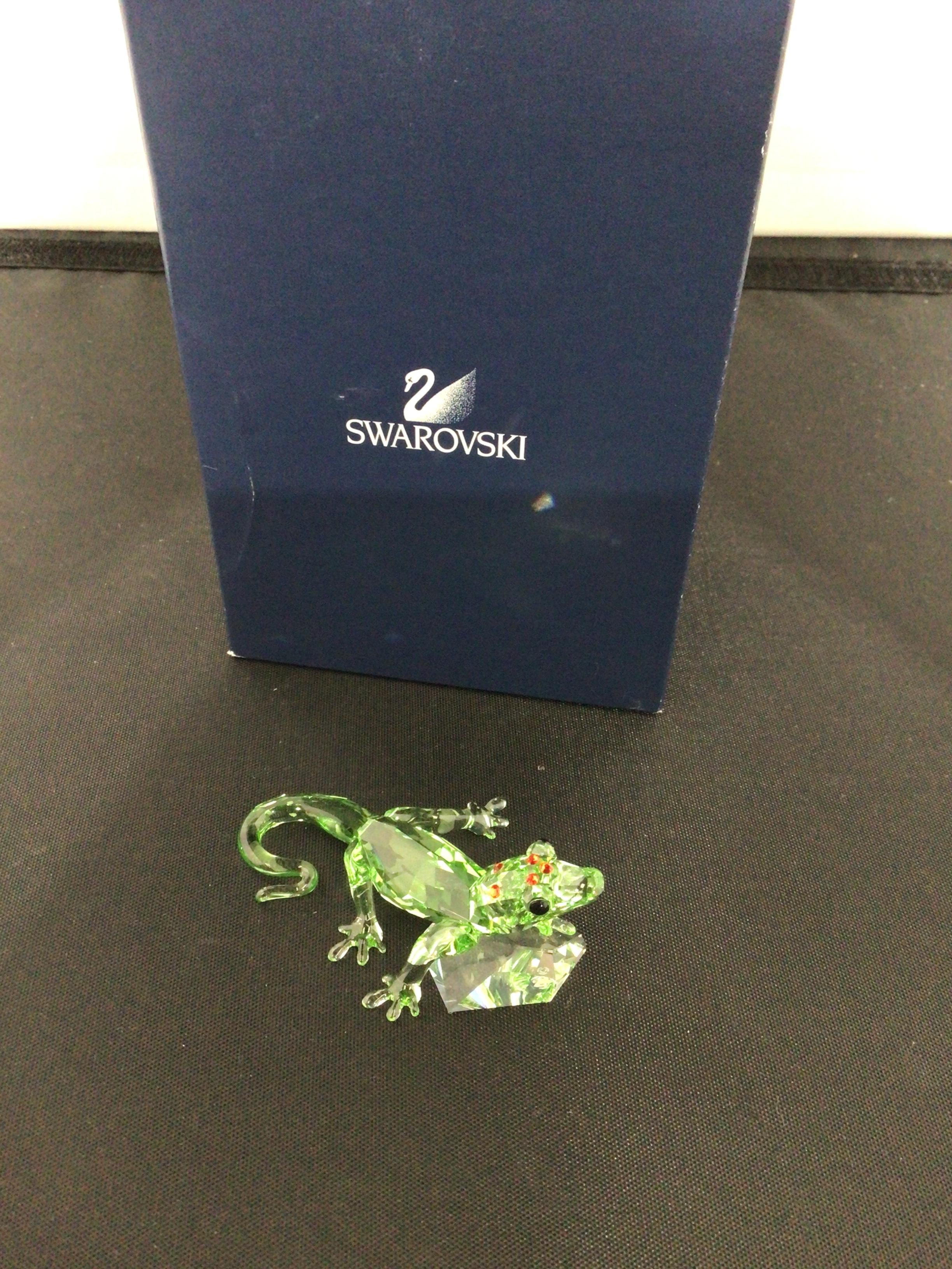 A Swarovski faceted green crystal figurine depicting a gecko or lizard, detailed with black bead eyes and small red accents on its head and back. It is presented alongside its original dark blue retail box, which prominently features the white “SWAROVSKI” text and iconic swan logo.