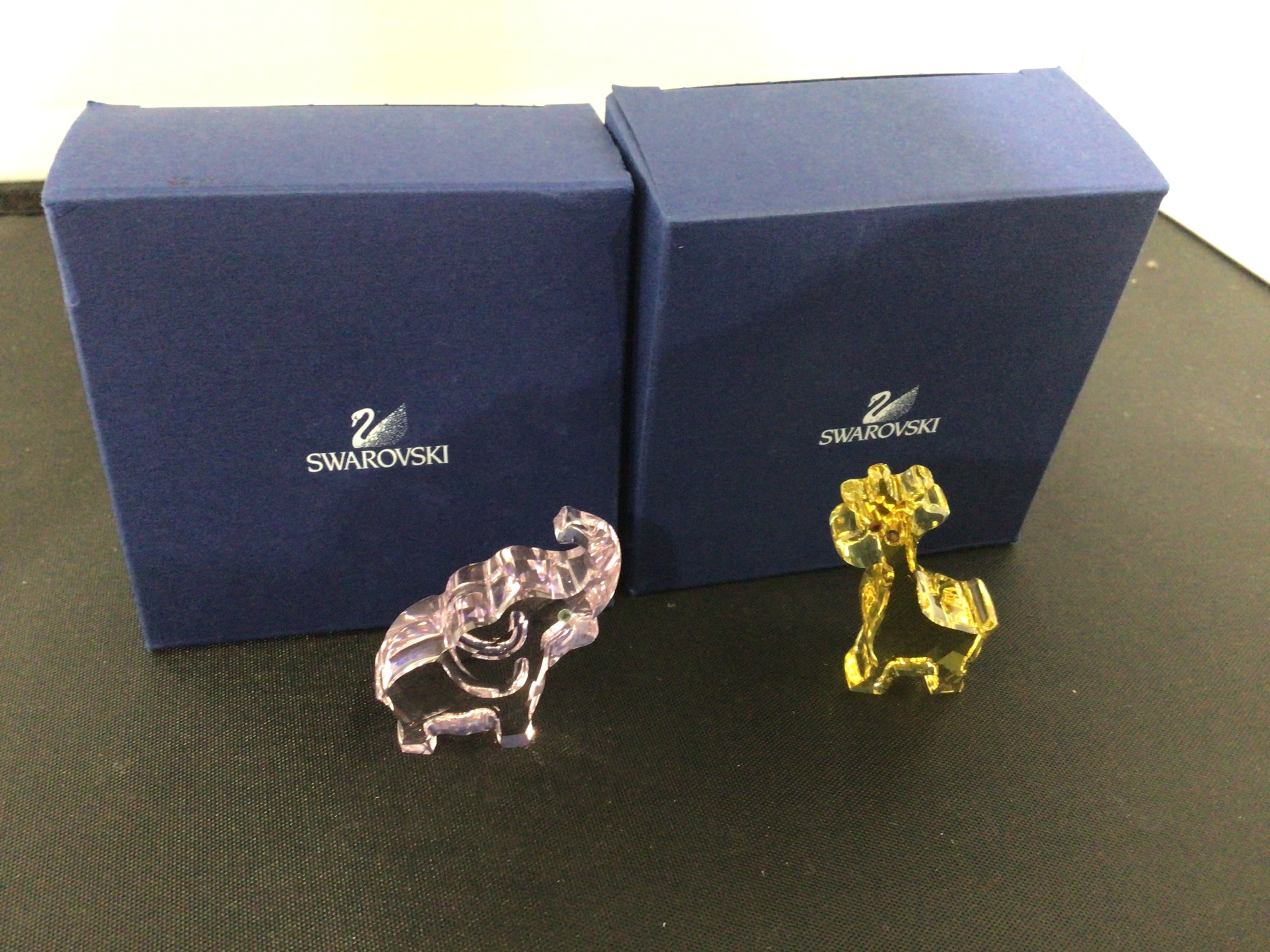A pair of Swarovski crystal figurines. One figurine is a faceted elephant rendered in clear or light pink-tinted crystal. The other figurine is a faceted Giraffe in amber-toned crystal, accented with two small red details near the head. Both figurines are presented in their original navy blue cardboard boxes, each clearly displaying the “SWAROVSKI” brand name and its iconic swan logo.