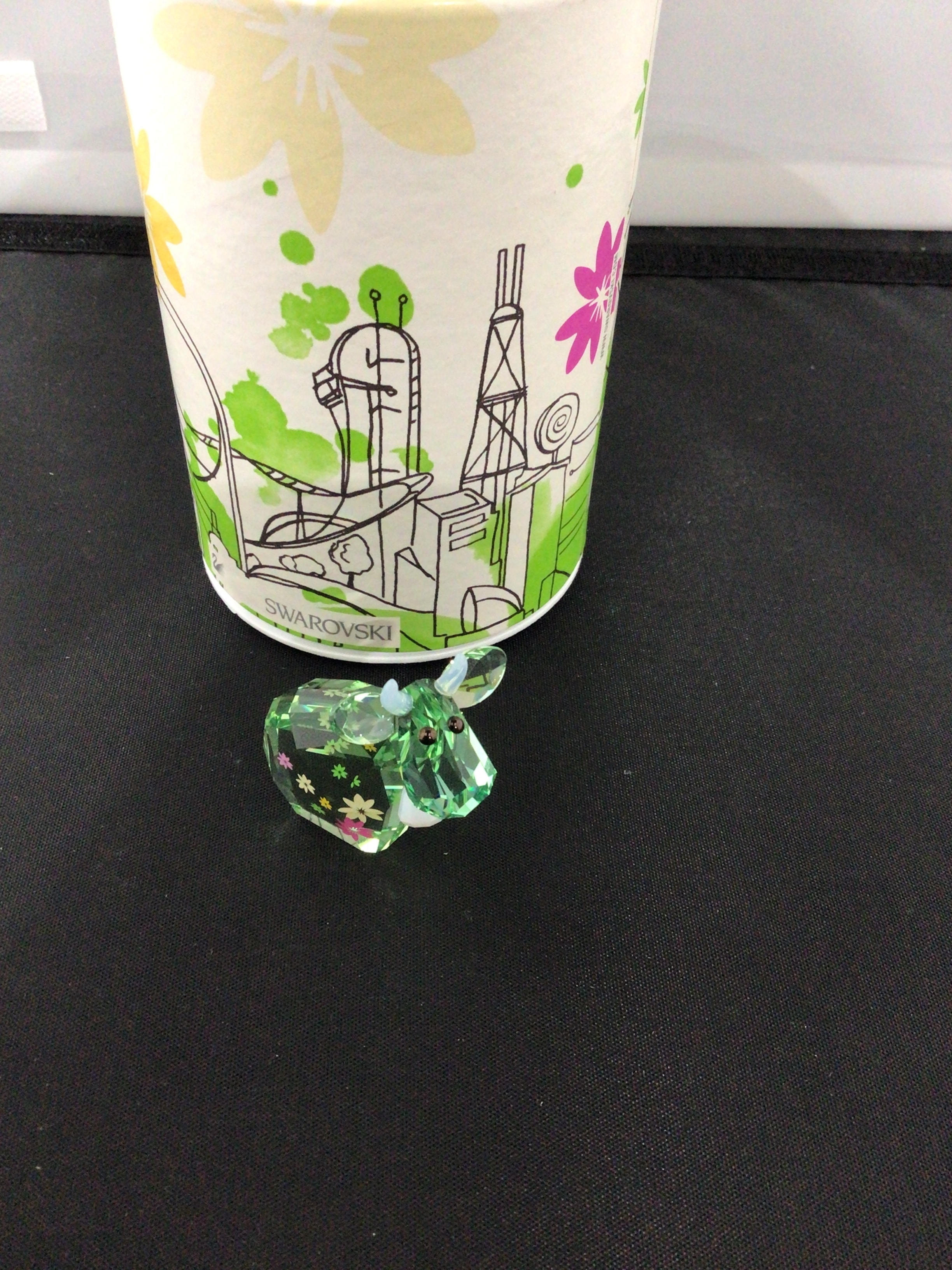 A Swarovski Lovlots ‘Flower Mo’ cow figurine, identified as a Limited Edition from 2008. This modern faceted crystal figurine depicts a bovine animal, crafted primarily from transparent green crystal. It features colorless or opalescent accents for the horns and snout, and dark, bead-like eyes. The body of the figurine is adorned with small, multicolored floral motifs in pink, yellow, and white. The figurine is accompanied by a paper cup bearing the ‘SWAROVSKI’ brand name, featuring line drawings of structures and colorful floral designs.