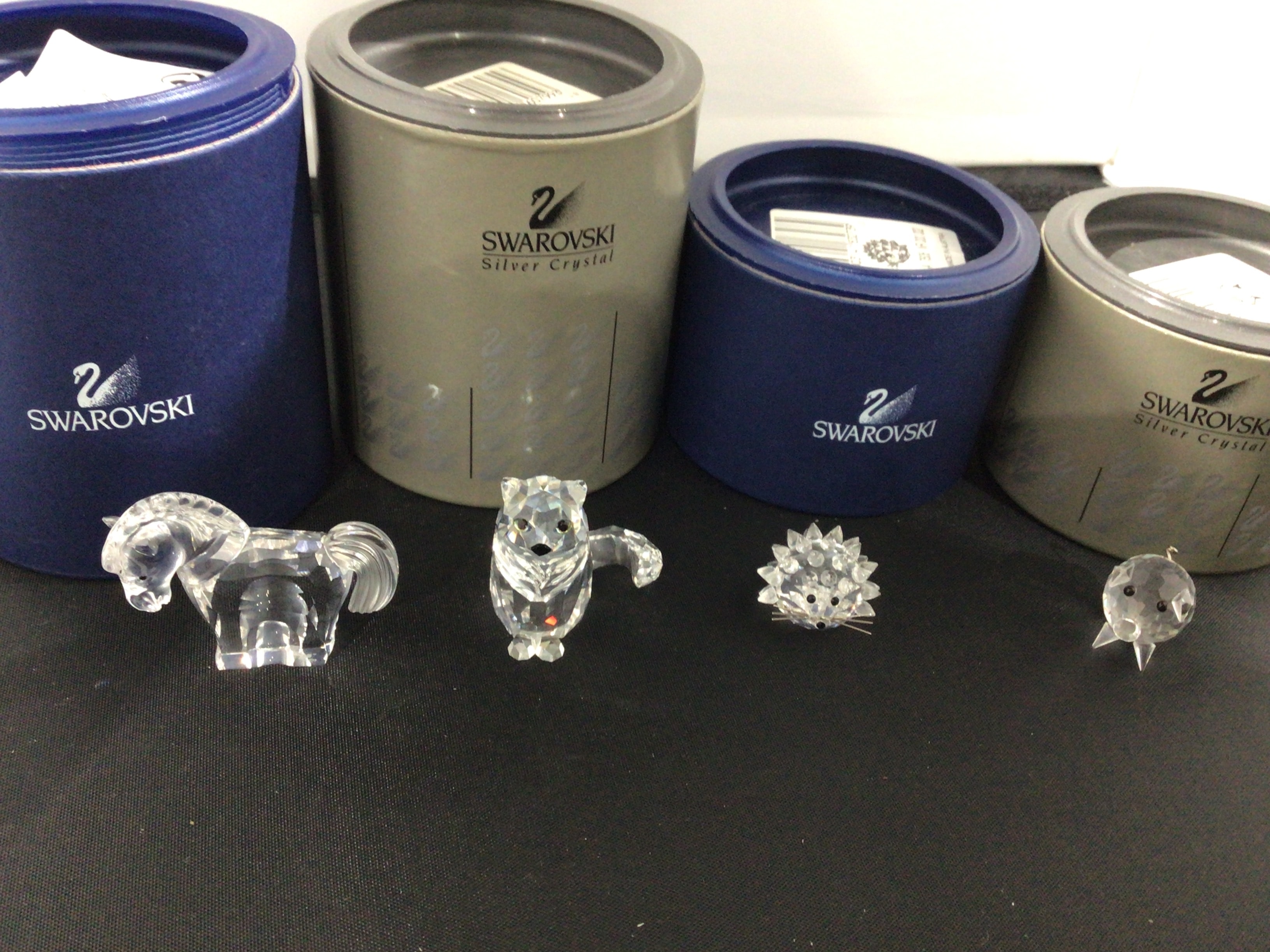 A group of four Swarovski Silver Crystal animal figurines, likely from the modern period. The figures depict a horse, a Fox, a hedgehog, and a small pig. They are accompanied by four cylindrical storage containers, two in blue and two in a grey/silver tone. Each container is prominently marked with the “SWAROVSKI” brand name and its distinctive swan logo; the grey containers additionally bear the inscription “Silver Crystal.”