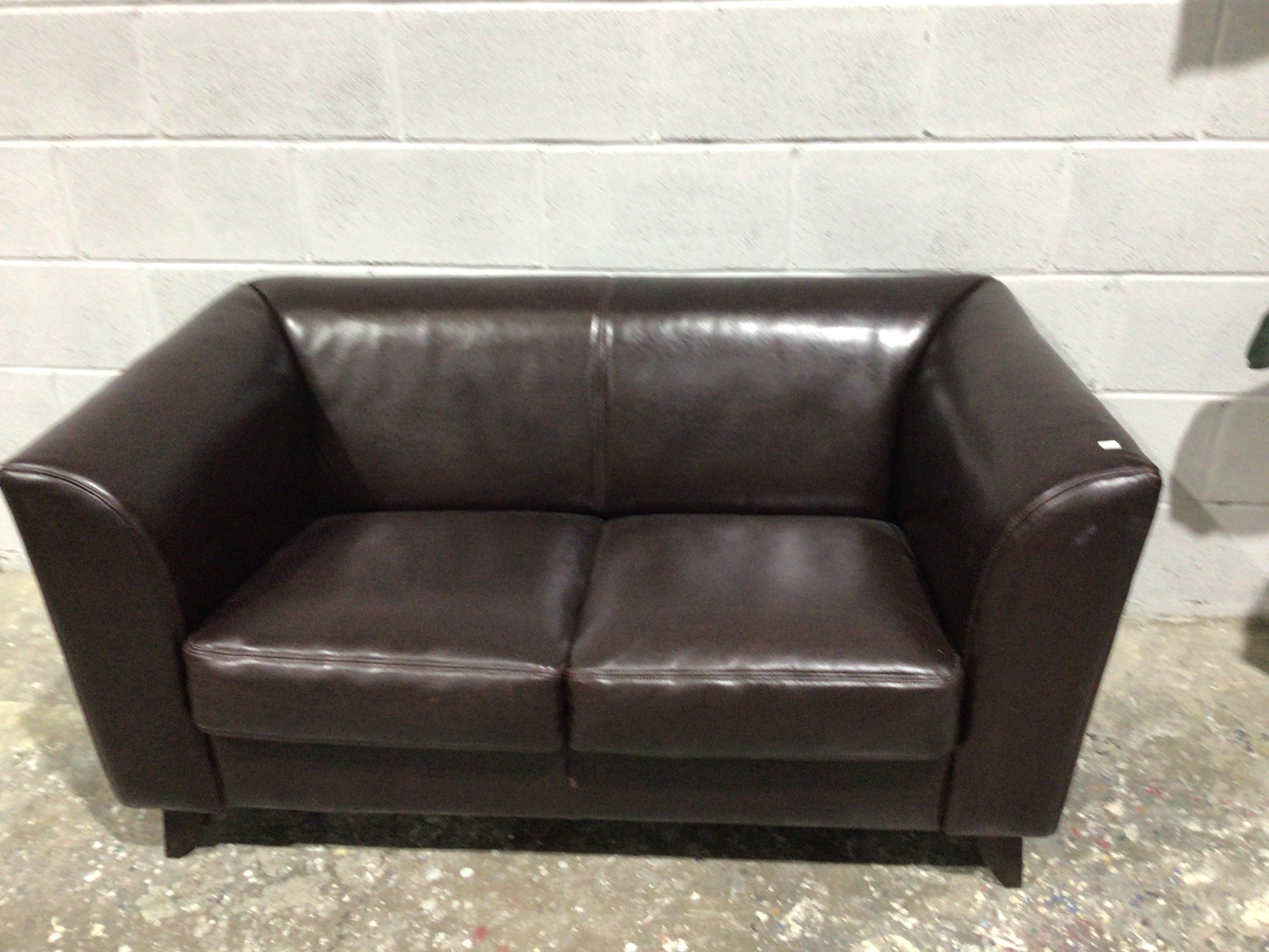A contemporary Flash Furniture HERCULES Diplomat Series Two Seater Sofa . Upholstered in a dark brown, possibly espresso-colored, LeatherSoft material. The design features clean lines with squared arms and back cushions, consistent with a modern aesthetic from the late 20th or early 21st century. It sits on short, dark block feet.