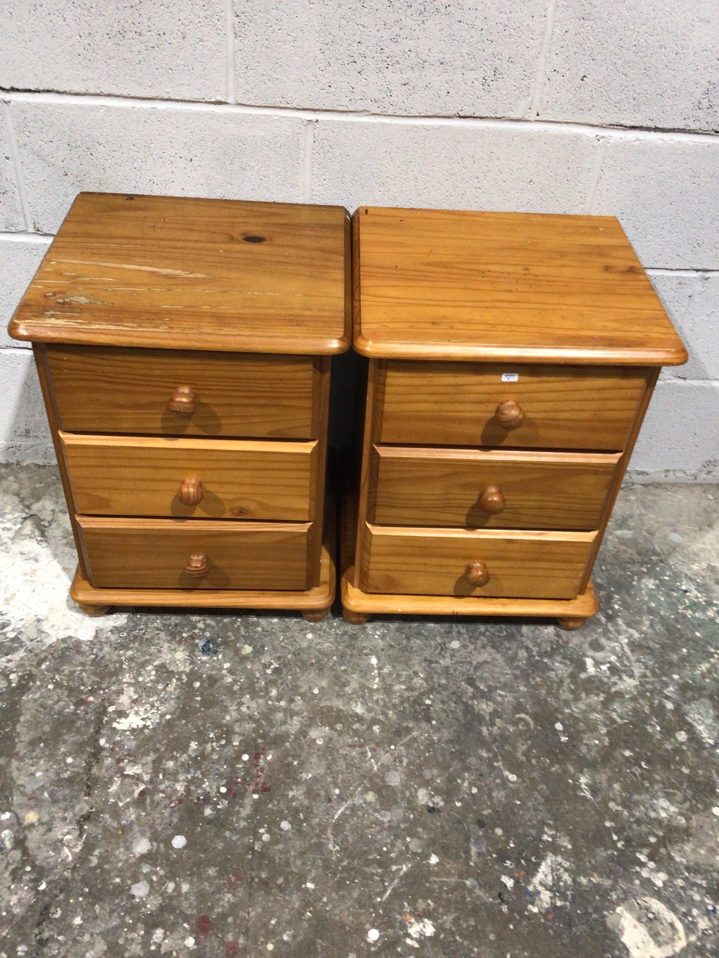 A pair of matching three-drawer bedside chests, crafted from a light-toned pine wood exhibiting a prominent grain. The design features rounded edges on the tops and bases, with each drawer equipped with a turned wooden knob. The style is consistent with modern or contemporary furniture, likely dating from the late 20th to early 21st century. One unit bears a small white sticker on the upper drawer, displaying numerical text.