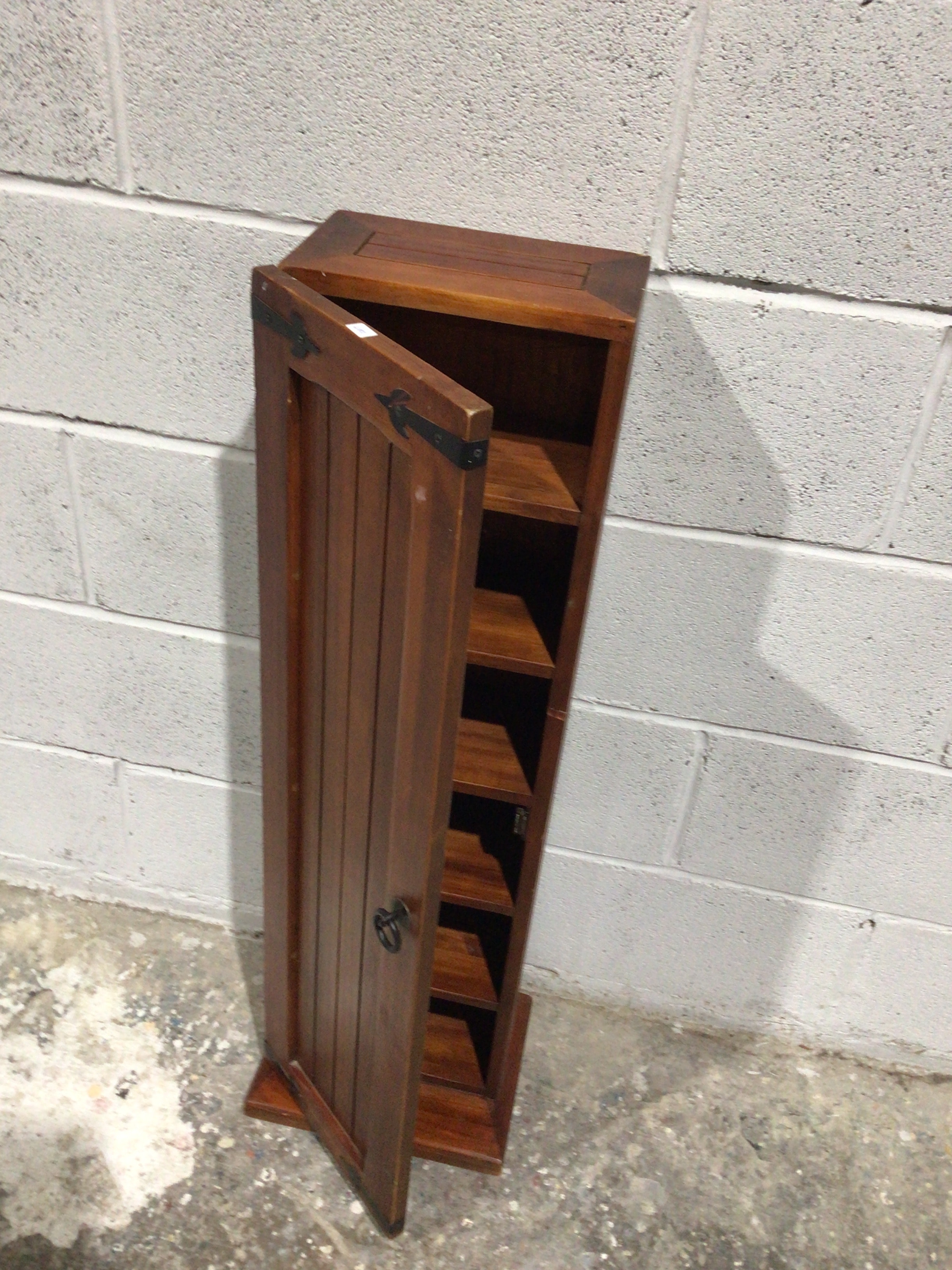 A tall, narrow, modern-style wooden storage cabinet, finished in a warm reddish-brown stain. It features a single hinged door with vertical plank detailing, secured by two dark-toned metal strap hinges and a coordinating dark metal ring pull. The interior contains multiple fixed shelves, suggesting its function as a media storage unit. A small, unreadable white sticker or label is visible on the upper left edge of the open door.