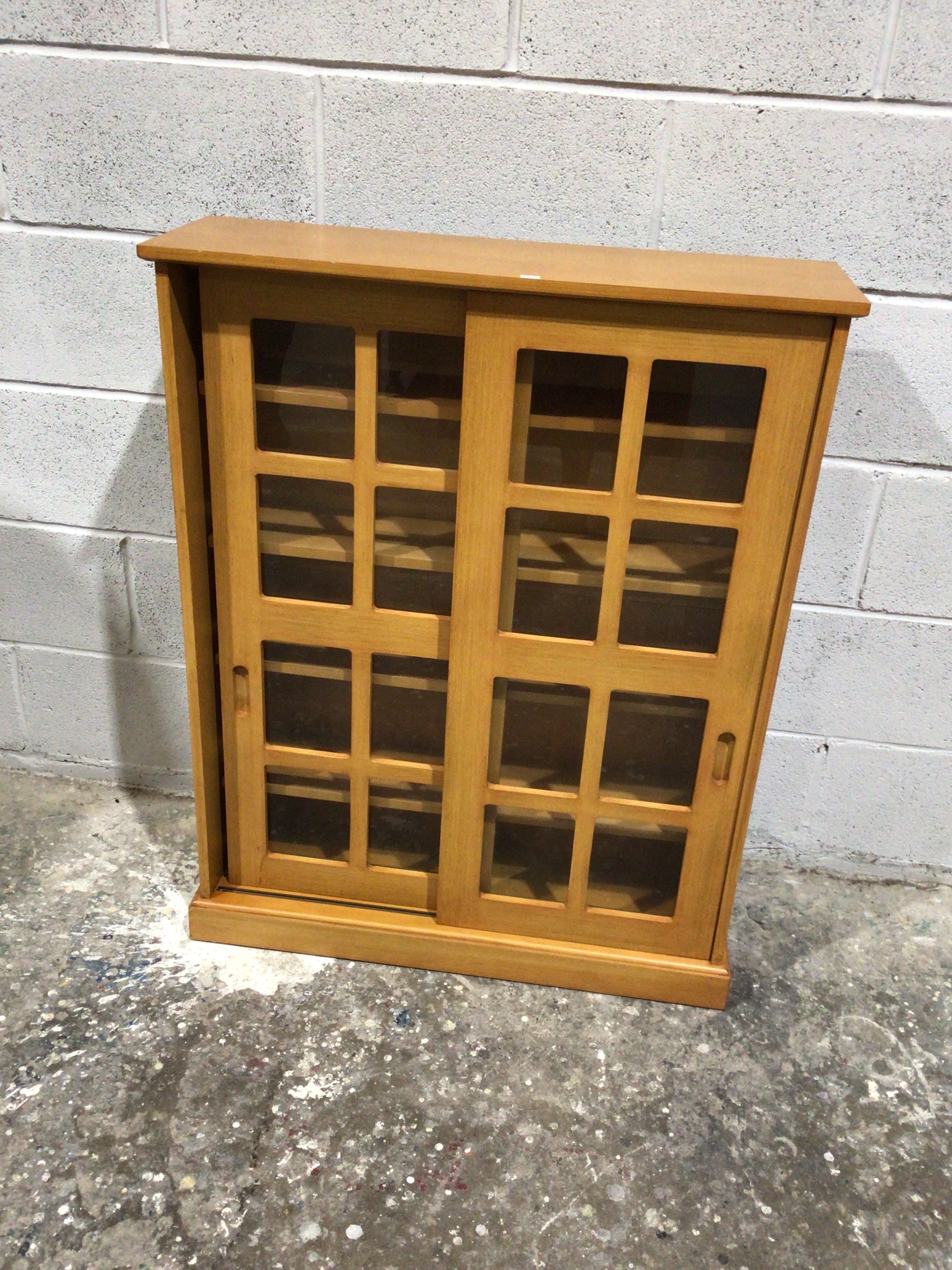 A contemporary Mission style oak bookcase, featuring two sliding doors with grid-patterned glass panels, each divided into nine sections. The doors are fitted with integrated vertical finger pulls, and internal shelving is visible through the glass. Constructed from light-toned oak or oak veneer, the piece exhibits a clean, utilitarian aesthetic with a subtle modern style.