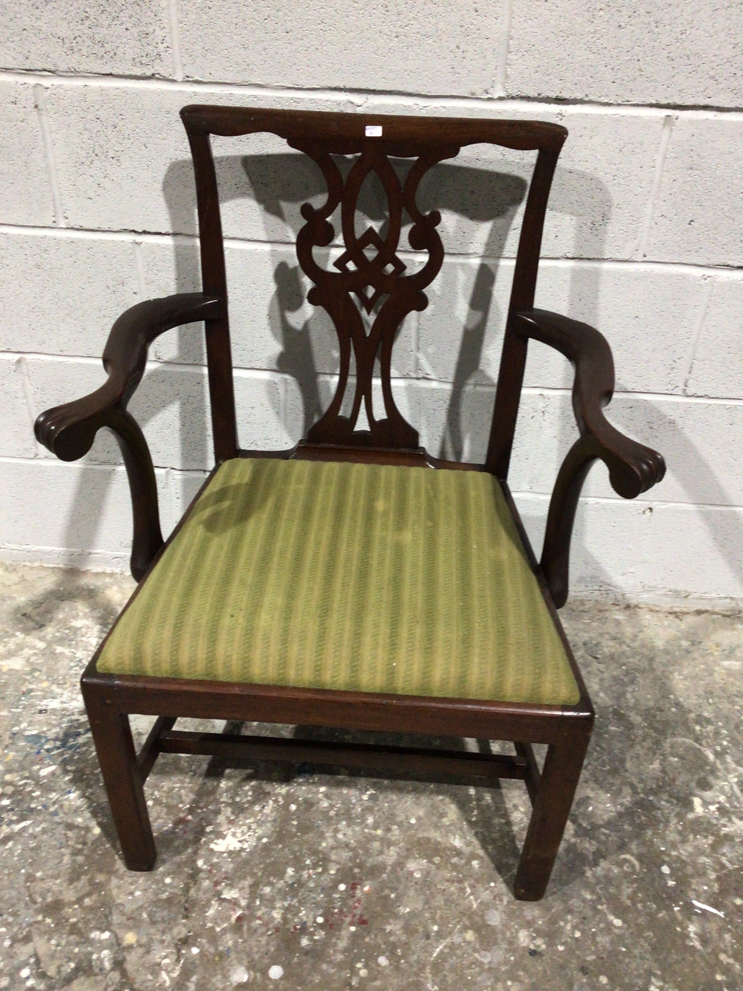 A Chippendale style mahogany armchair, likely a later revival or reproduction, featuring a shaped crest rail and a pierced splat with ornate scrollwork and interlaced elements. It has gracefully curved arms terminating in scrolled ends. The frame is supported by straight, square-section legs connected by stretchers. A small, illegible white sticker is visible on the center of the crest rail. The seat is upholstered in a striped green fabric.