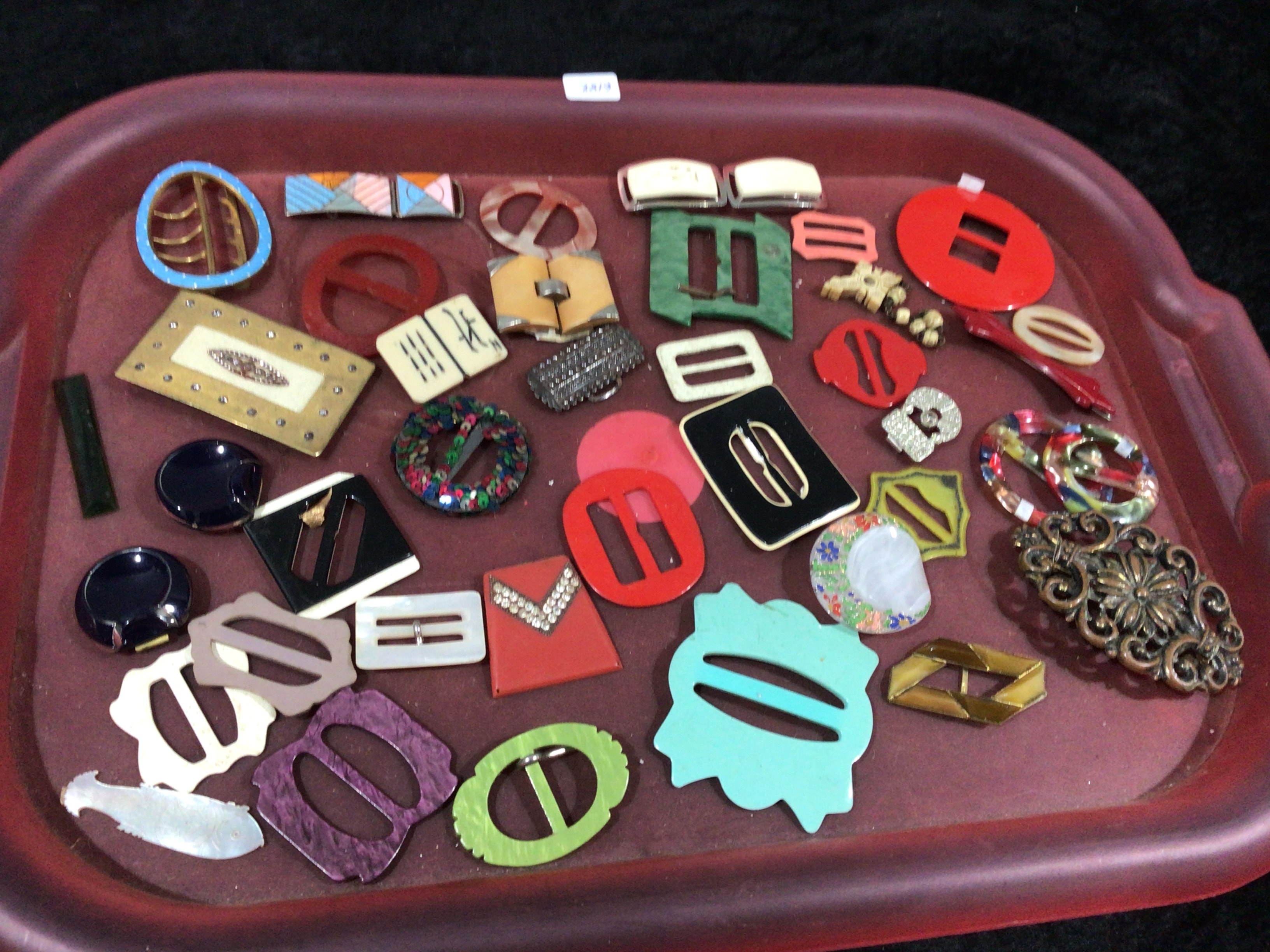 A collection of approximately 40-50 assorted belt buckles, clasps, and decorative jewelry components, presented on a reddish-brown tray. The lot comprises a wide variety of shapes, sizes, and styles, ranging from simple geometric and streamlined forms to more ornate designs and novelty shapes. Materials observed include various plastics (e.g., solid colored, marbled, translucent, opaque), different metals (some appearing brass, plated, or enameled), mother-of-pearl (including one fish-shaped piece with etched details), rhinestones, and sequins. The styles suggest a mix of periods, primarily vintage to antique, consistent with mid-20th century and earlier examples.