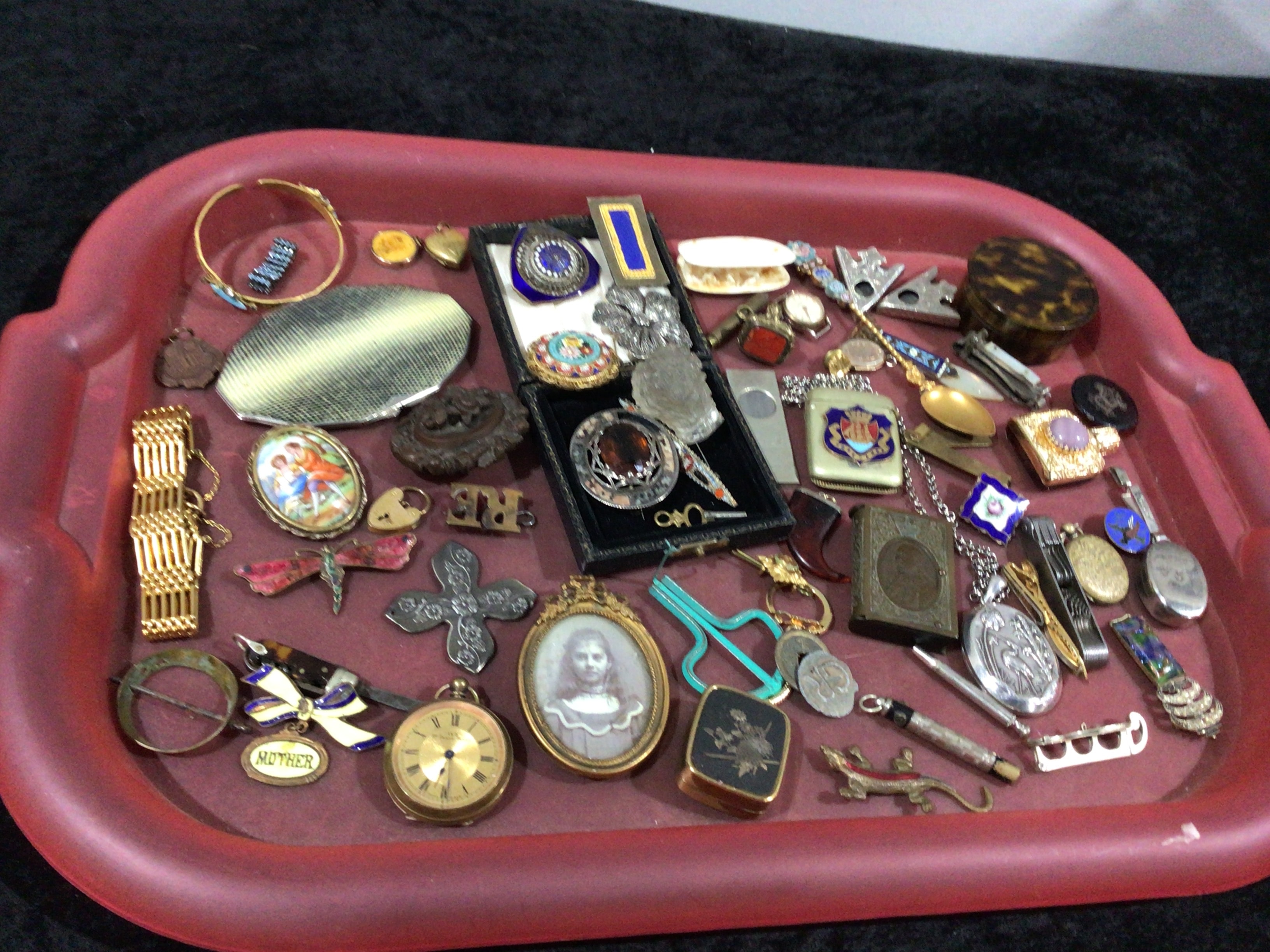 A diverse collection of approximately forty to fifty antique and vintage personal items. The assortment includes various brooches, pendants, lockets, pocket watches, bracelets, small boxes, charms, and miniature tools. Materials present are a mix of gold-toned and silver-toned metals, colorful enamel, tortoiseshell, carved wood or resin, and possibly bone or ivory, accented with glass, porcelain miniatures, and various stones. Styles broadly span from late Victorian to mid-20th century, encompassing pieces such as cameos, micro-mosaics, heraldic crests (on a lighter-like item), and intricate filigree designs. Visible text includes “MOTHER” on an oval charm and the initials “RE” on another.