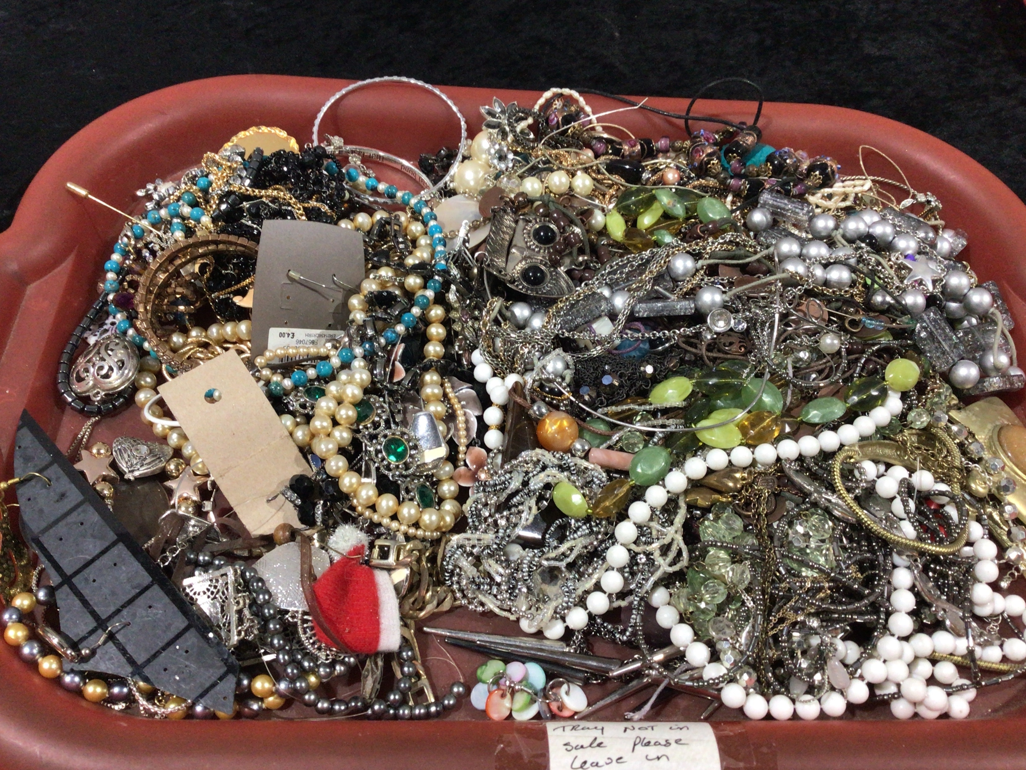 This lot comprises a substantial quantity of mixed costume jewelry, presented in a red plastic container (marked “Tray not in Sale please Leave in”). The collection includes necklaces, bracelets, earrings, and brooches, featuring diverse materials such as base metals (gold- and silver-toned), faux pearls, various glass and plastic beads, imitation gemstones (e.g., green, clear, black, turquoise), and some natural stone-like elements. Styles vary, encompassing contemporary and vintage aesthetics, suggesting an accumulation from different periods. Additional visible markings include a brown tag with “£4.00” and “ER0134CRH,” and the partial text “our bond” on a silver-toned bangle.