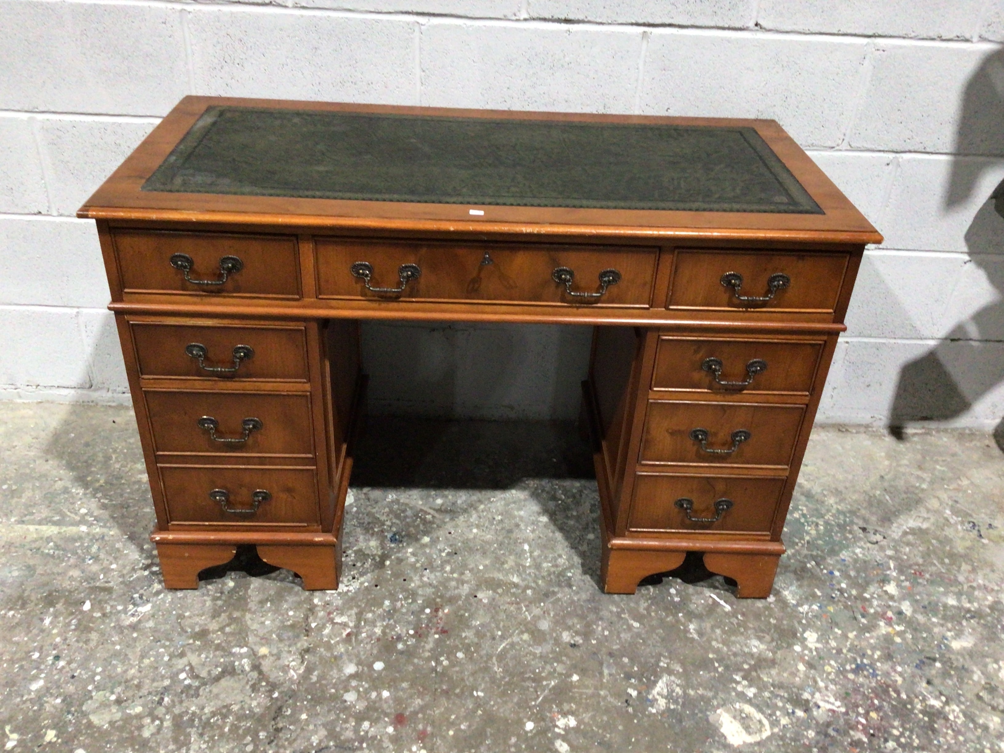 A Vintage George III Style Yew Wood Twin Pedestal Green Leather Top Desk