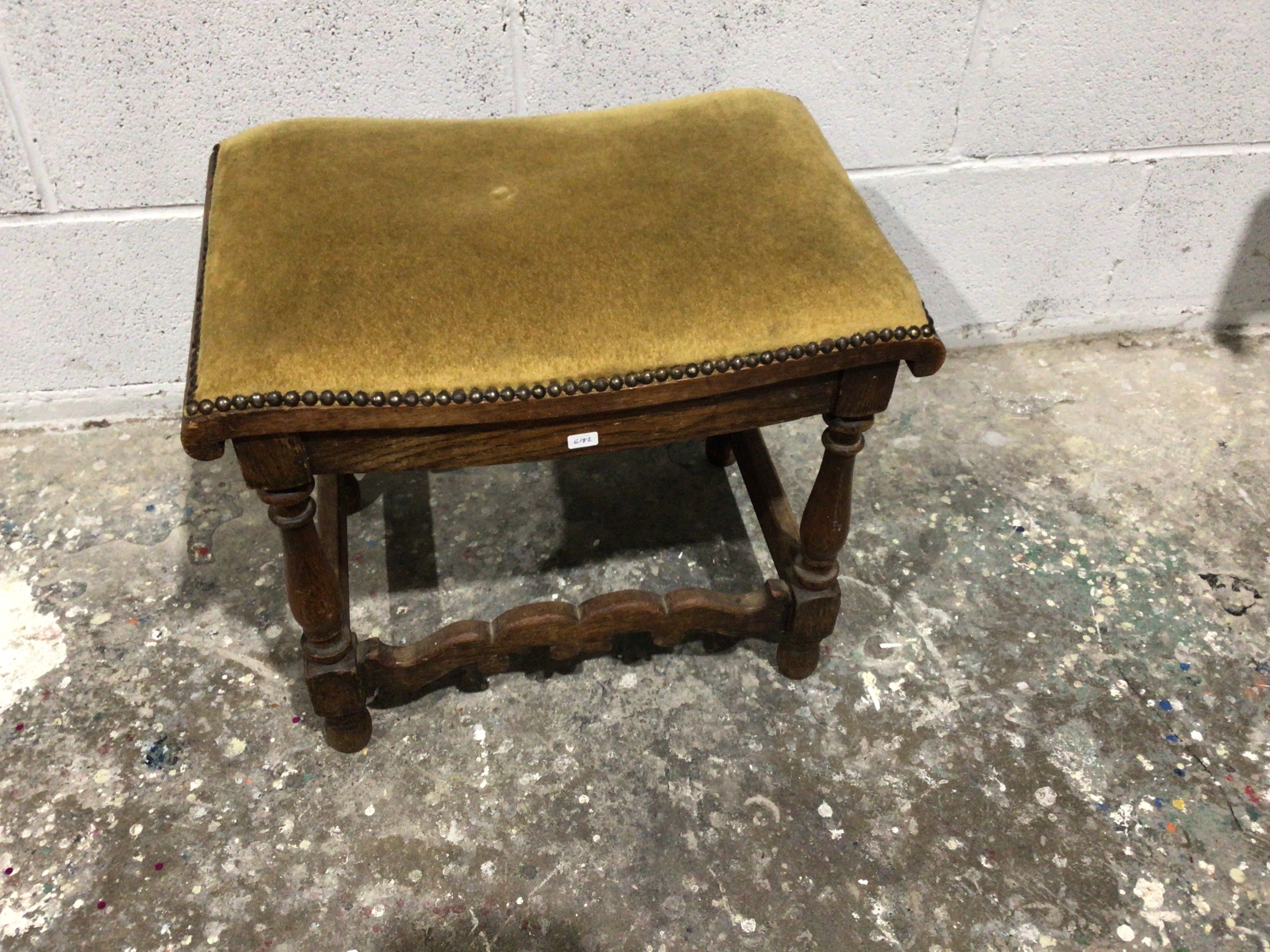 A Mid Century Wooden Footstool with Green Fabric and Hobnail Trim