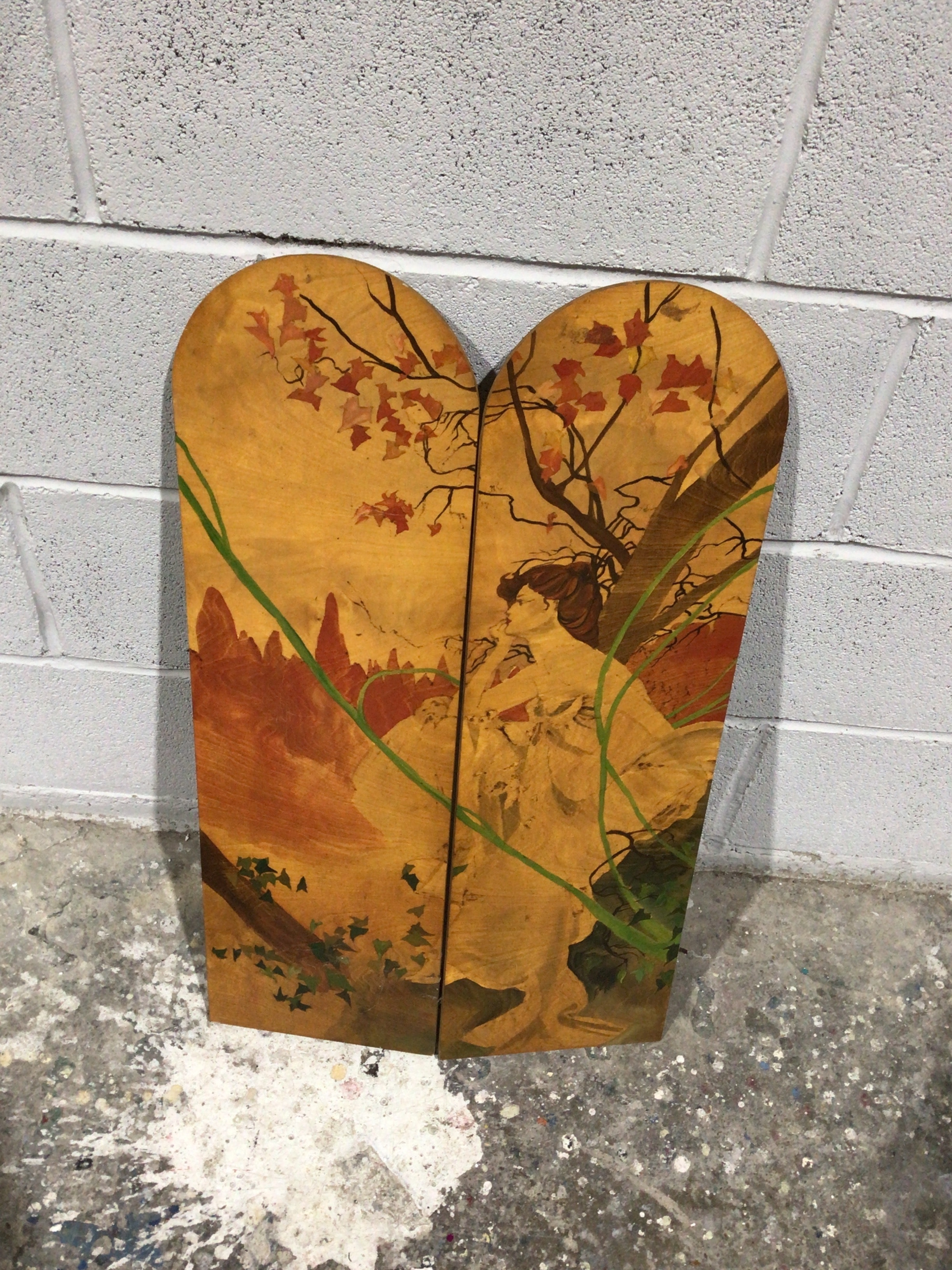 A pair of wooden panels, executed in the Art Nouveau style, likely dating from the late 19th or early 20th century. Each panel features an arched top and shaped bottom, designed to form a symmetrical composition when placed together. The artwork depicts a female figure in profile amidst autumnal foliage and flowing green vines, set against a stylized landscape of reddish-brown forms. The design appears to be painted or stained directly onto the light-colored wood, with the natural wood grain visible through the artwork. There are no discernible text or artist’s markings.