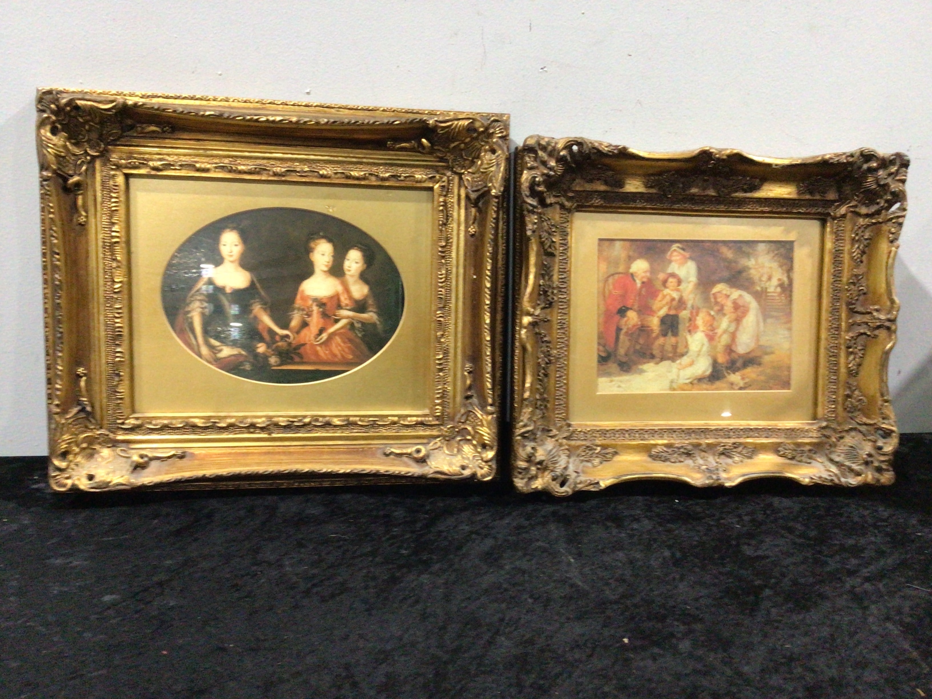 A pair of framed prints, each presented within an ornate, deeply carved or molded giltwood (or composition) frame. The frames are characteristic of Rococo-revival or similar opulent styles, featuring acanthus leaf motifs and a textured finish. The left artwork is an oval-format print or reproduction, depicting three women in period European dress, suggestive of an 18th or early 19th-century portraiture style, presented within a plain beige matte. The right artwork is a rectangular print or reproduction, illustrating a multi-figure genre scene with an elderly man, a boy, and women in a domestic or pastoral setting, indicative of 19th-century European art, similarly matted. No discernible text or artist’s signatures are visible on either print.
