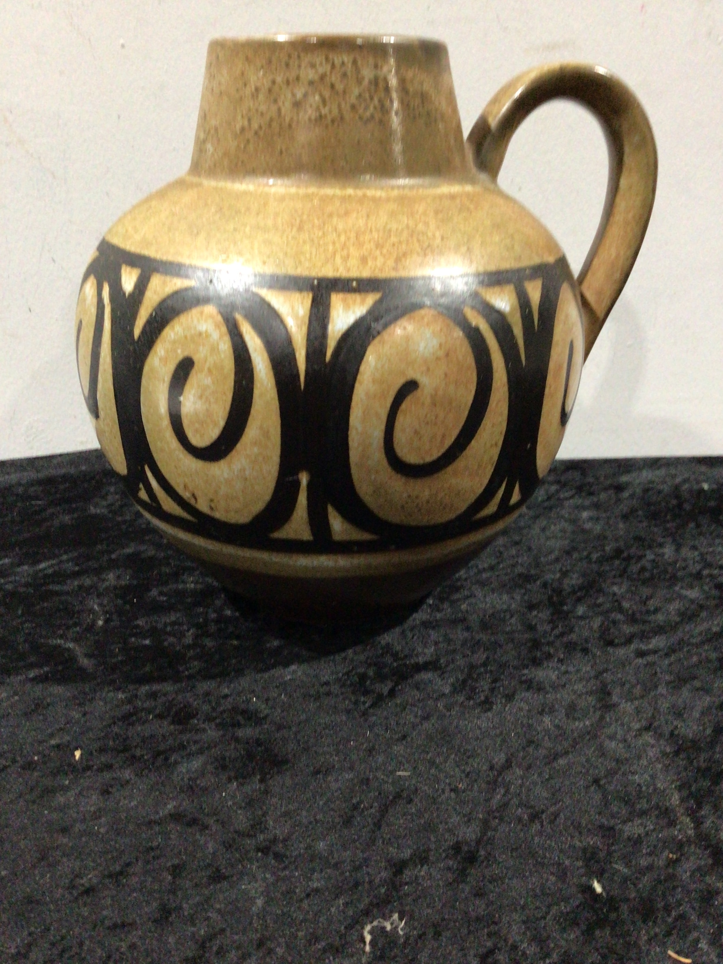 A handled ceramic jug or vase, exhibiting a globular body, a short, tapering neck with a flat rim, and a single C-scroll handle. The vessel is primarily glazed in a speckled light brown or tan, with the neck and handle featuring a darker, mottled brown textured glaze. A prominent decorative band of stylized black curvilinear and geometric patterns encircles the widest part of the body. While no specific text or maker’s marks are visible, the robust form and abstract decoration suggest a mid-20th century, possibly European studio pottery aesthetic.