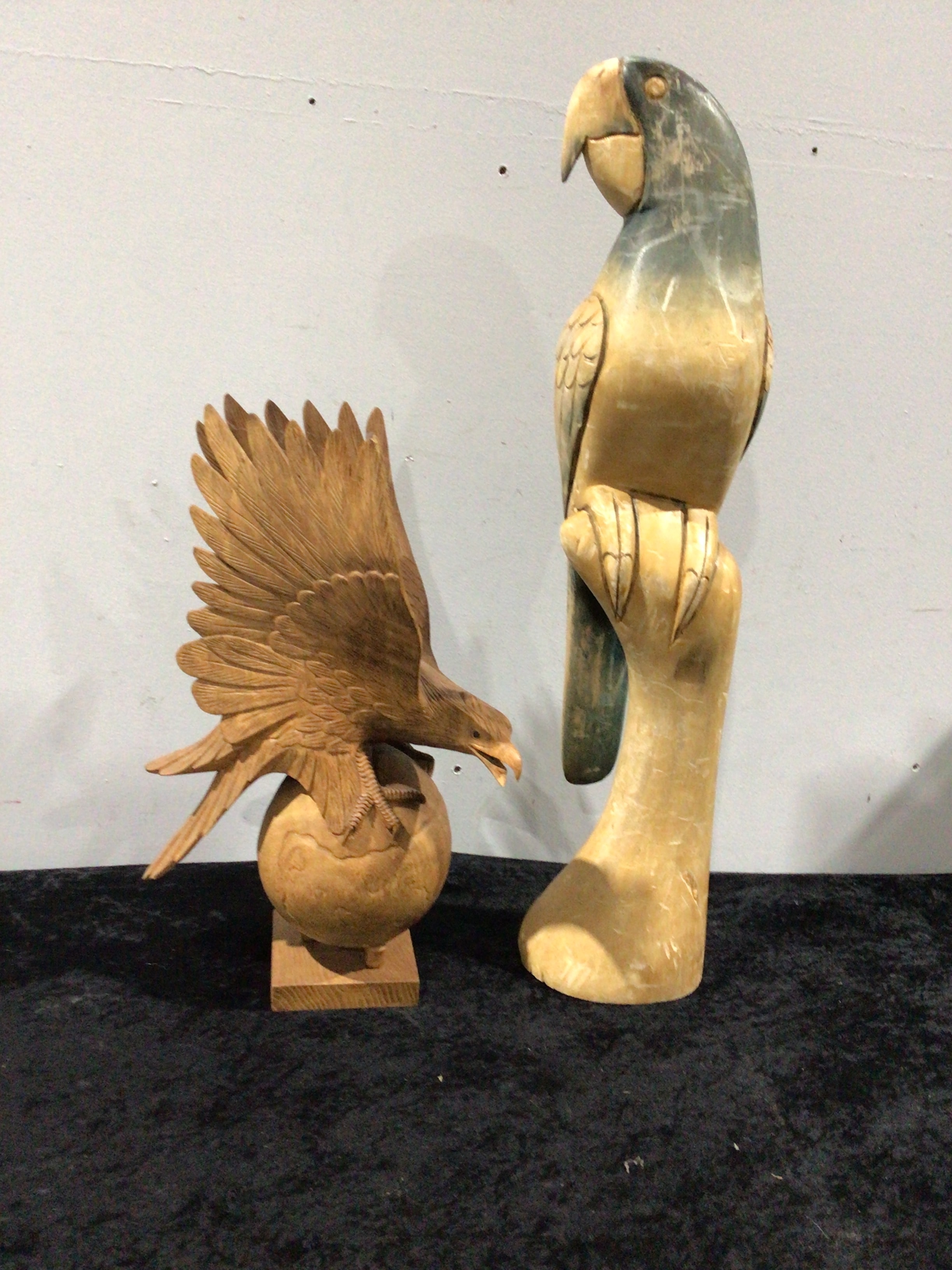 A pair of hand-carved wooden avian sculptures. The piece on the left depicts a natural-toned bird of prey, possibly an eagle or hawk, poised with spread wings and talons gripping a sphere, elevated on a rectangular base. Its carving shows fine detail, particularly in the feathers. The larger piece on the right presents a stylized parrot or macaw, primarily in a natural wood finish accented with painted or stained pale blue/green on its back and wings. This figure includes an integral base simulating a perch. No visible text or identifying markings are apparent.