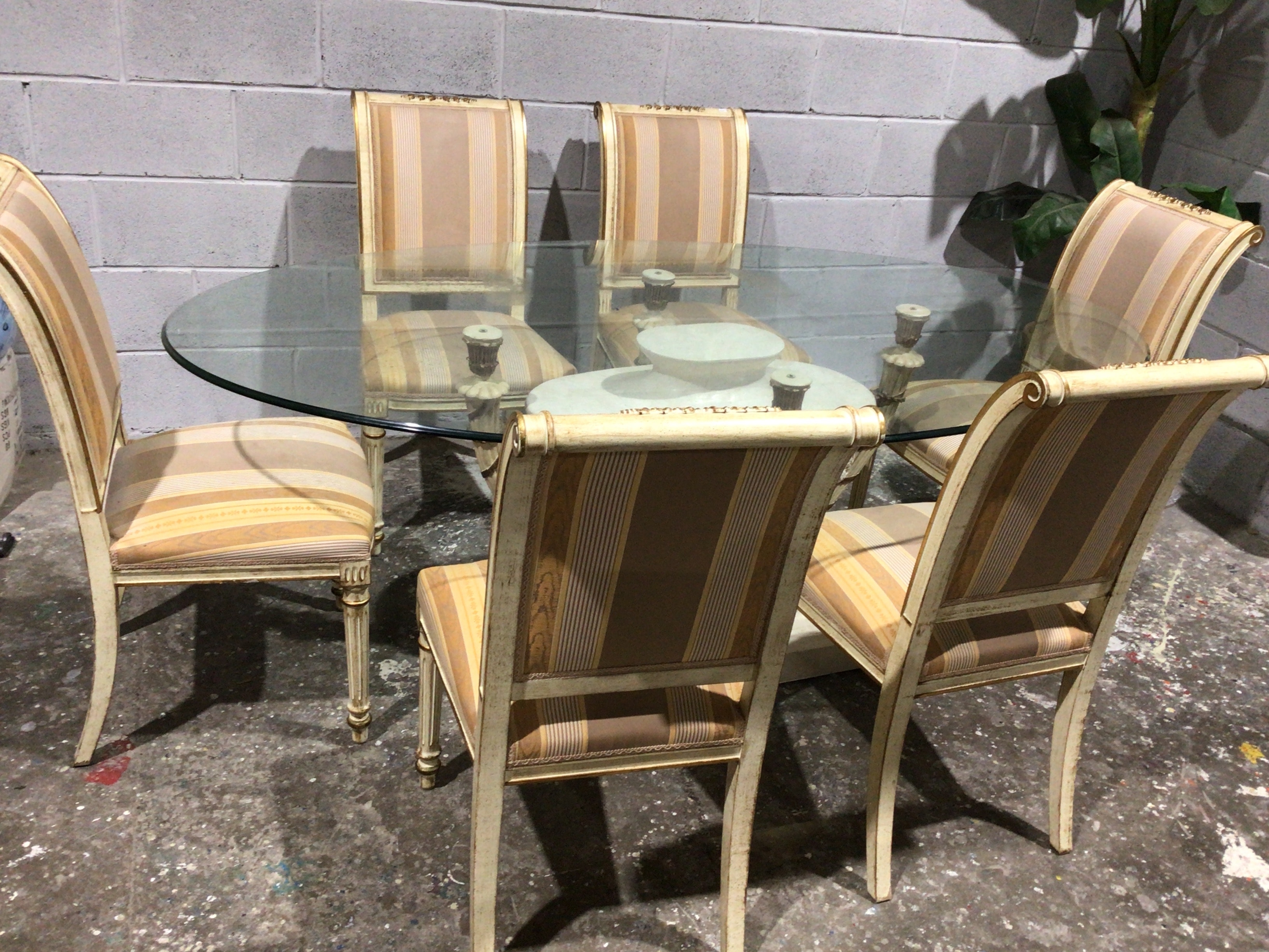 A six-piece dining set, including a round glass-top table and six chairs. The table features a clear circular glass top supported by a central pedestal base finished in an off-white or cream distressed and possibly gilded paint, featuring decorative urn-like elements. The six chairs have curved backs and seats upholstered in a striped fabric predominantly in shades of gold, tan, and cream, with varied stripe patterns. The chair frames are constructed from wood with a matching distressed off-white/cream and gilded finish, displaying Neo-classical design characteristics such as fluted legs and decorative molding or carving along the crest rails, some with small scroll details. No discernible text or manufacturer’s markings are visible on any of the pieces.