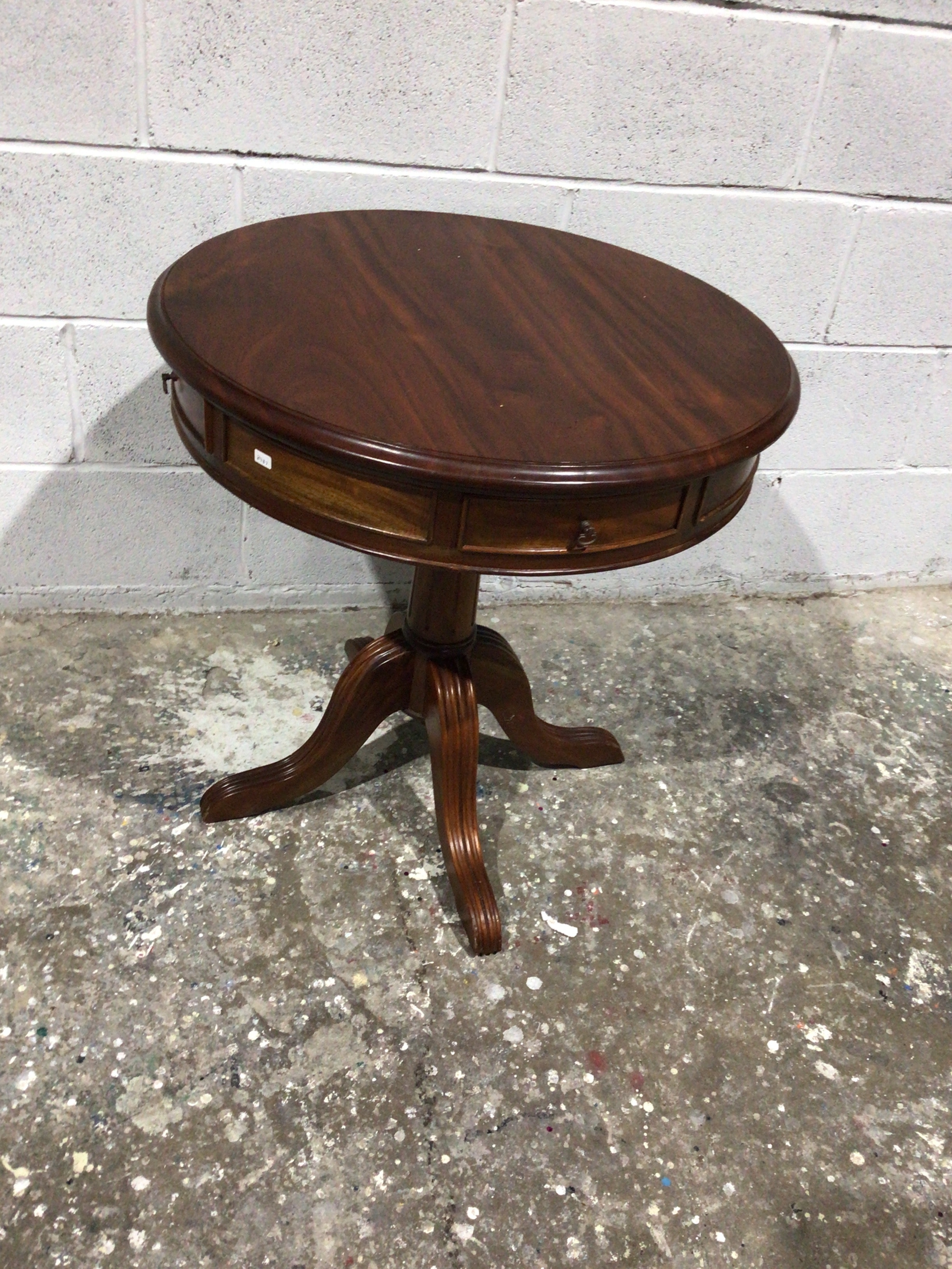 A Regency style oval drum table, crafted from dark, reddish-brown wood, likely mahogany or a mahogany-stained hardwood. It features a molded edge oval top over a deep apron with a single drawer fitted with a brass ring pull. The table is supported by a turned central pedestal and four reeded splayed saber legs. A small white sticker bearing an illegible numerical marking is affixed to the apron.