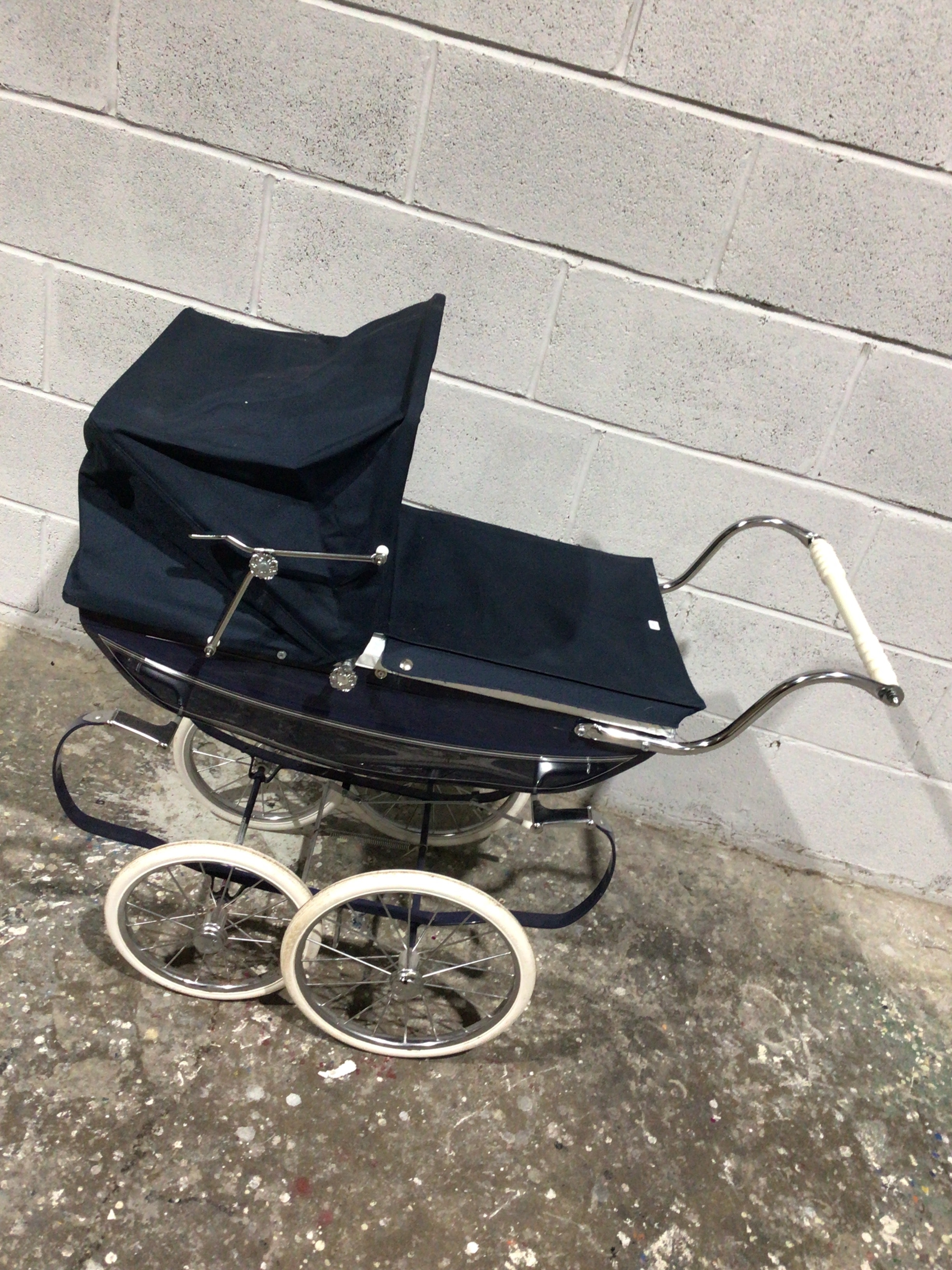 A Vintage Silver Cross Coach Built Baby Carriage, Navy Blue