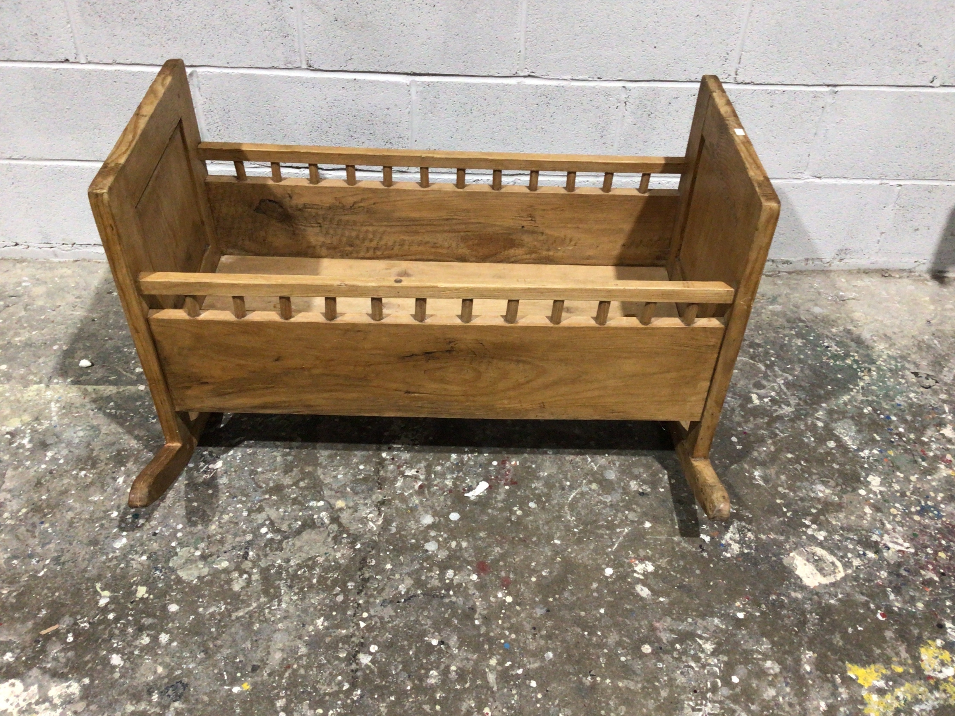 An American antique pine rocking cradle, constructed entirely of natural wood with a light to medium brown tone and visible grain. Its simple, unadorned design features solid panel ends and slatted sides made from rounded dowels, resting on curved rockers for gentle motion. No discernible text, manufacturer’s marks, or decorative carvings are visible on any surface.