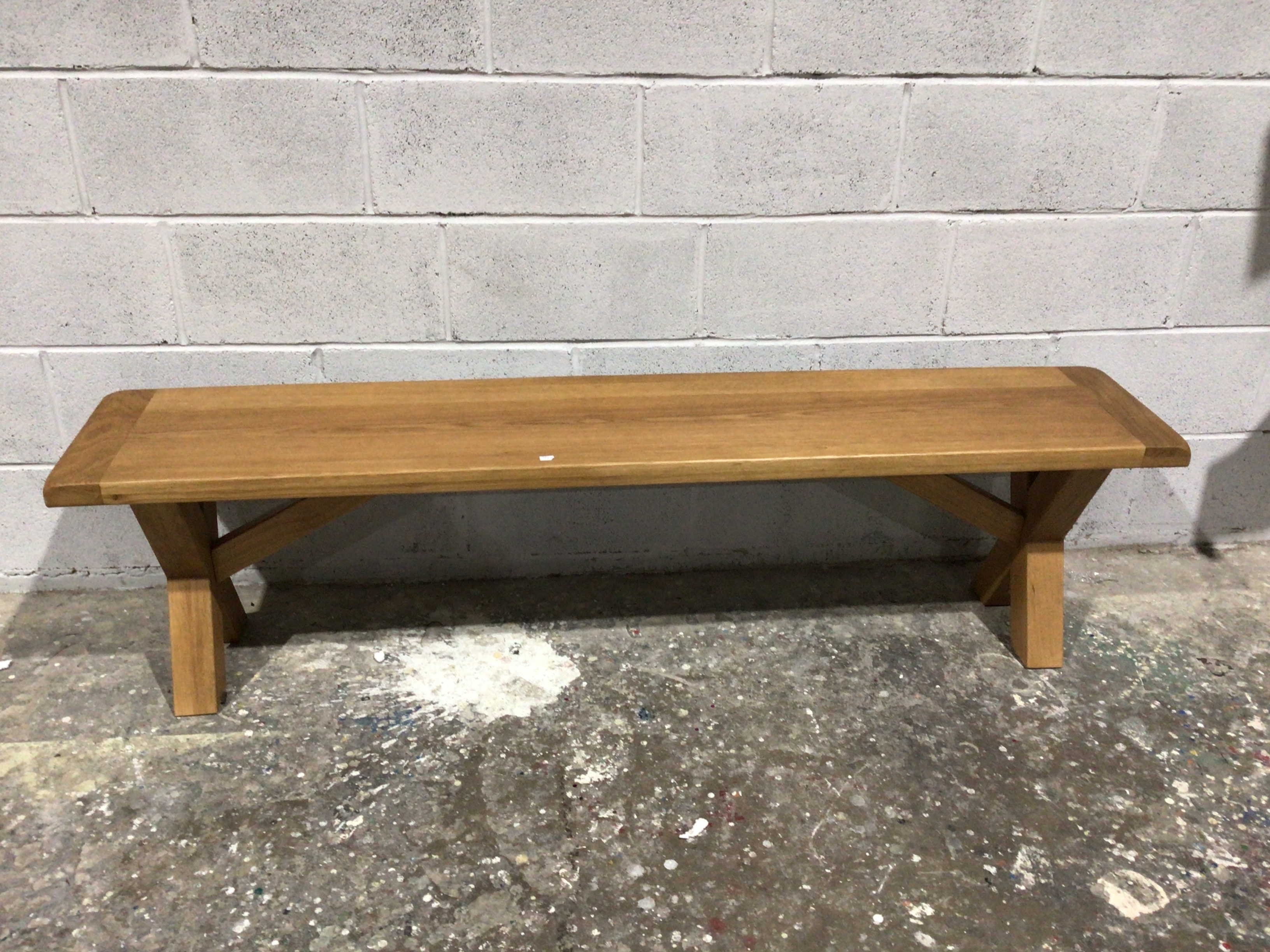 This rectangular wooden bench of modern or contemporary manufacture is constructed from light-toned solid wood, likely oak or a similar hardwood, and finished with a clear protective coating. The design features a robust X-frame trestle base supporting a solid plank top with subtly rounded edges. A small, white, rectangular sticker or label is present on the center of the top surface, but no legible text or other manufacturer markings are visible.