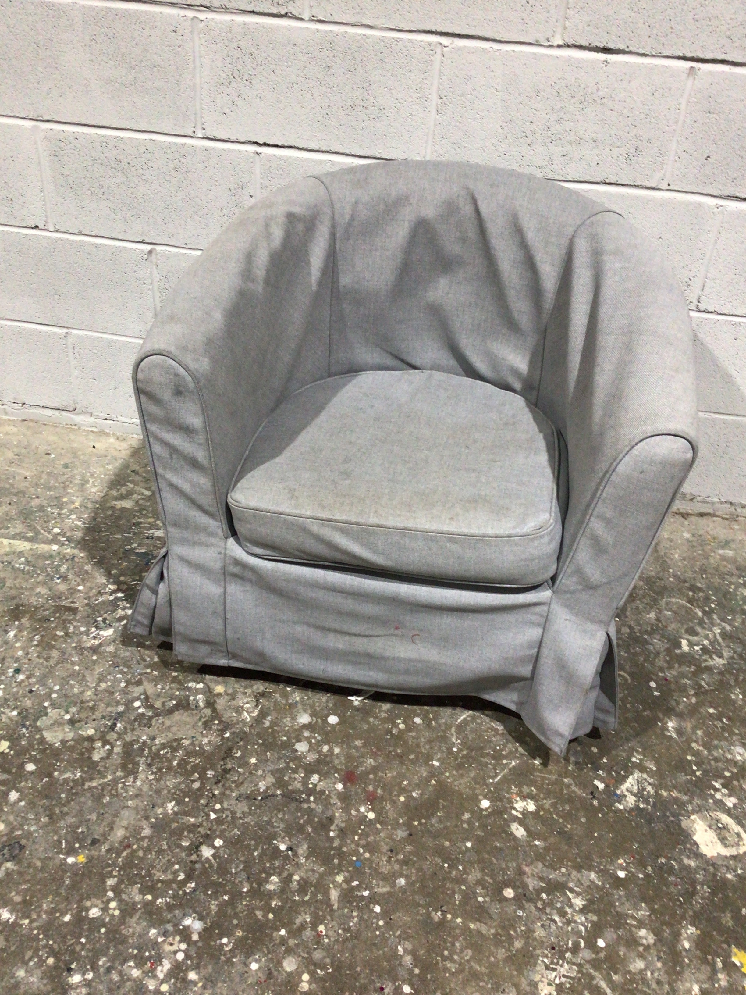 An upholstered armchair with a rounded back, featuring a removable, light gray fabric slipcover. The slipcover includes a separate seat cushion and a skirted base with split corners. The visible material is a plain-weave textile, likely cotton or a synthetic blend. No manufacturer’s marks or identifying text are visible. The chair’s form is similar to the IKEA TULLSTA armchair.
