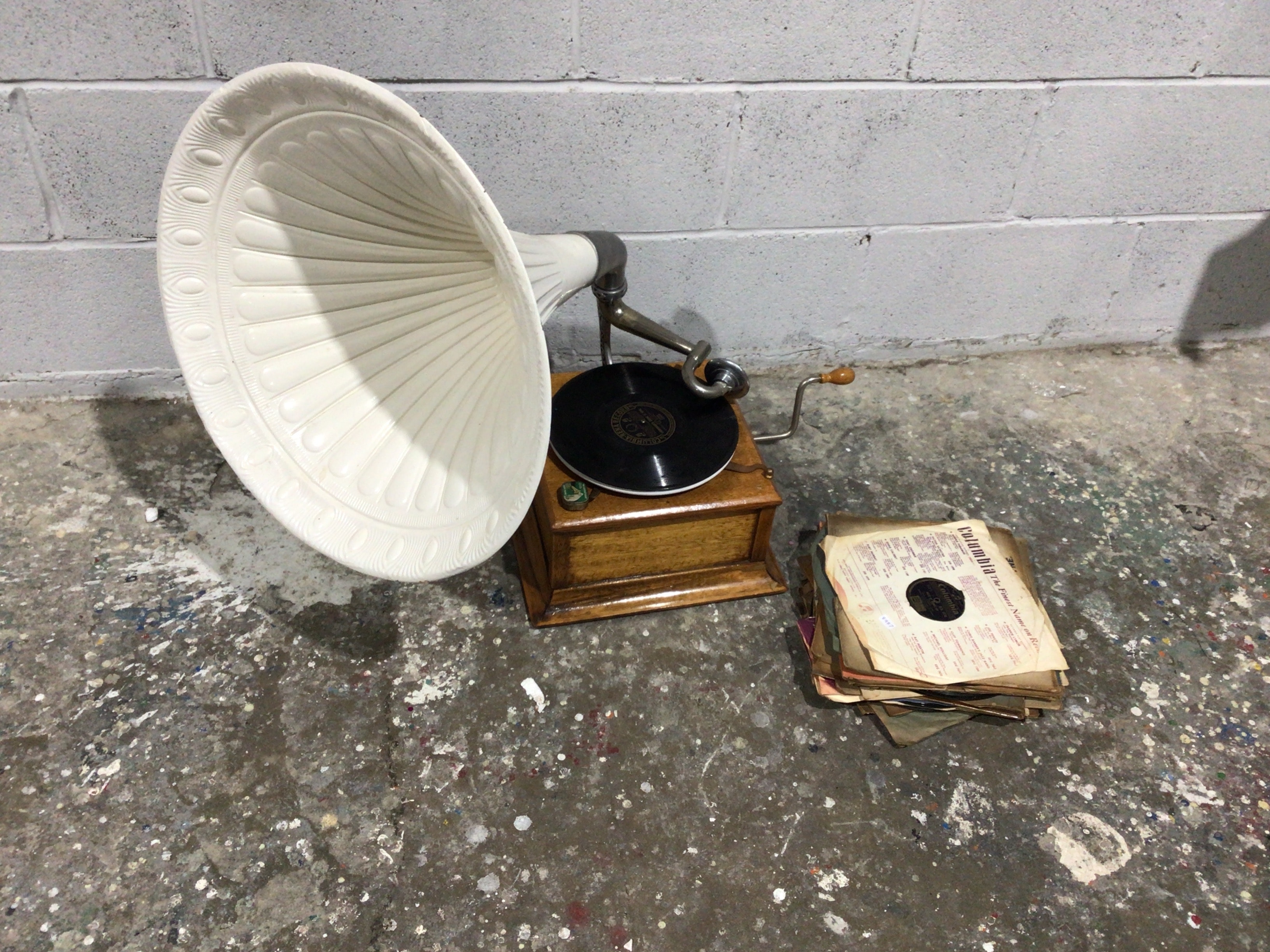 An early 20th century external-horn gramophone, featuring a large, off-white horn, likely ceramic or painted metal, decorated with radial fluting and an embossed border. The central mechanism, including a black turntable and metal tone arm with a hand crank, is housed in a polished, light brown wooden cabinet, likely oak. A black shellac record is present on the turntable. Accompanying the unit is a collection of approximately ten 78 RPM records in worn paper sleeves, one clearly bearing ‘Columbia The Finest Name on’.