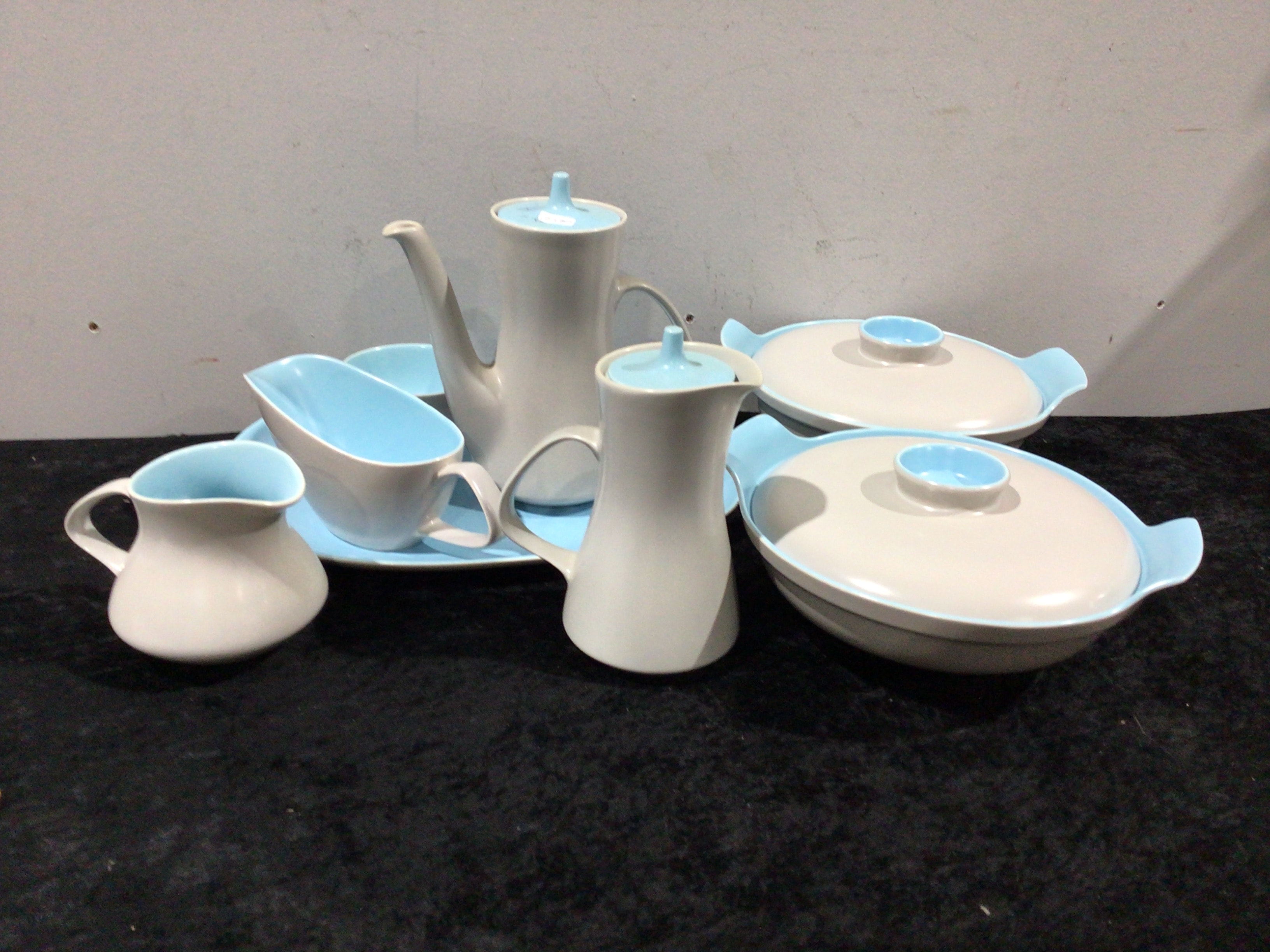 A collection of Poole Pottery Twintone serving wares in the Sky Blue and Dove Grey colorway. This multi-piece set exhibits a Mid-Century Modern aesthetic, rendered in an off-white or light grey ceramic-like material with contrasting light blue interiors, handles, and lid accents. The collection includes a tall coffee or hot beverage pot, a smaller pitcher, a creamer or small jug, a gravy or sauce boat, a large oval serving tray, and two covered oval serving dishes. All pieces feature smooth, organic, and minimalist forms. A small white sticker with illegible handwritten numbers is present on the lid of the taller pot.