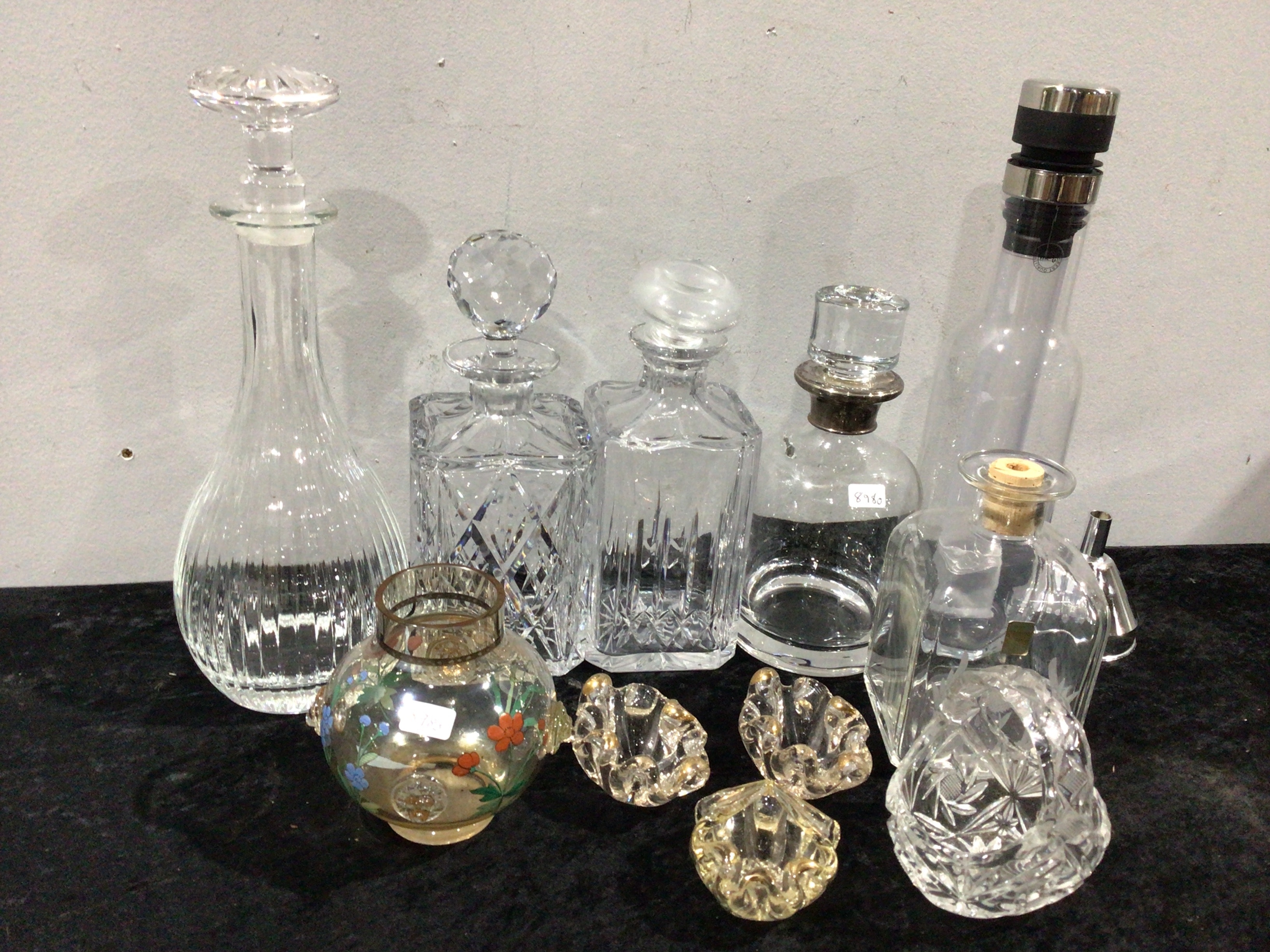A Collection of Clear Glass and Crystal Decanters and Decorative Items One Silver Topped