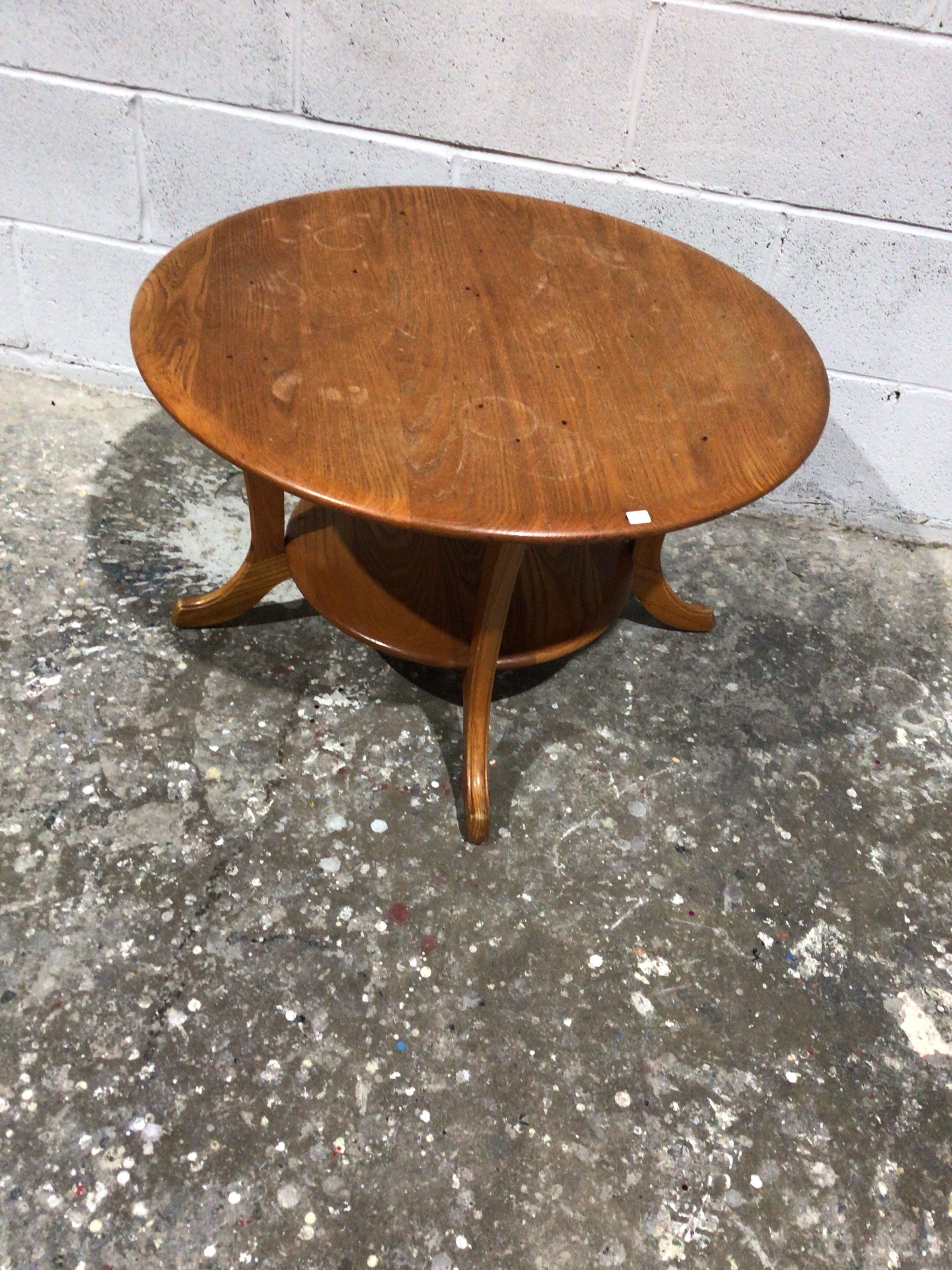 A 1940s Leo Jiranek by Heywood-Wakefield round coffee table. This vintage two-tier occasional table, designed in a Mid-Century Modern or Danish Modern inspired style, is constructed from a medium-toned wood, consistent with a maple finish as seen in comparable examples. It features a round main tabletop and a smaller, round lower shelf, both supported by a central column from which three curved, splayed legs extend.