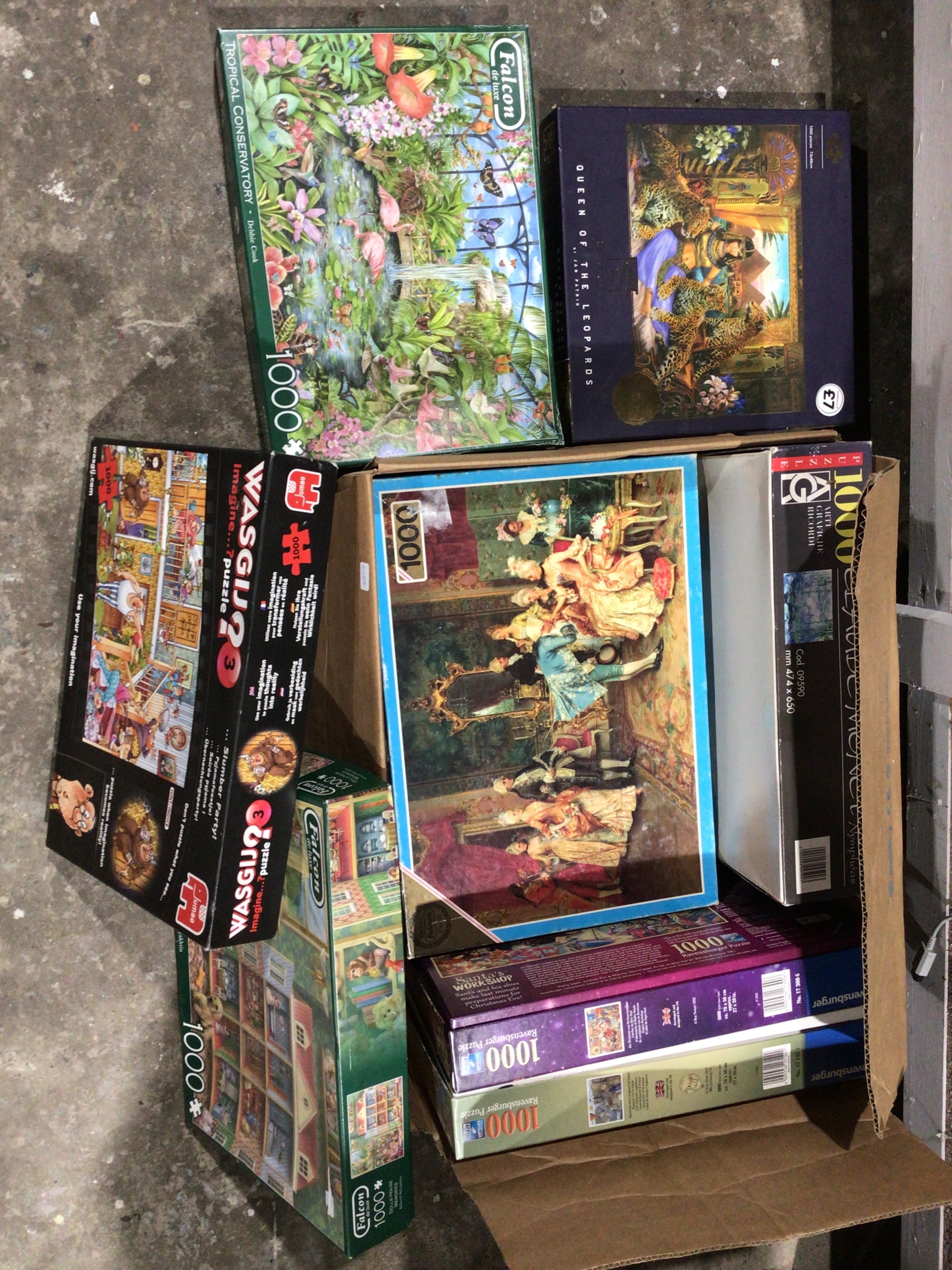 A Falcon De-luxe jigsaw puzzle titled ‘The Reception’ by Arturo Ricci, forming part of a larger collection of approximately ten jigsaw puzzles. This collection predominantly comprises 1000-piece sets from various manufacturers including Falcon de luxe, WASGIJ? (Jumbo), Ricordi Arte Grafiche, and Ravensburger. Specific titles identified include ‘Tropical Conservatory’ by Debbie Cook, ‘Doll’s House’, ‘Santa’s Workshop’, ‘Queen of the Leopards’ by Jan Patrik, and ‘WASGIJ? imagine…?’ puzzles, one of which is titled ‘Slumber Party!’. Another Ricordi Arte puzzle is possibly ‘Nympheas’. The styles represented span contemporary nature scenes, detailed illustrative works, classical art reproductions (including a Rococo-style painting), and fantasy art with an Egyptian theme. The ‘WASGIJ? imagine…?’ puzzles feature humorous, cartoonish illustrations and contain multilingual text, such as Dutch (‘Gebruik je verbeelding om gedachten in werkelijkheid om te zetten!’) and German (‘Überraschungsparty!’). Most boxes indicate ‘1000 pieces’ and display dimensions.
