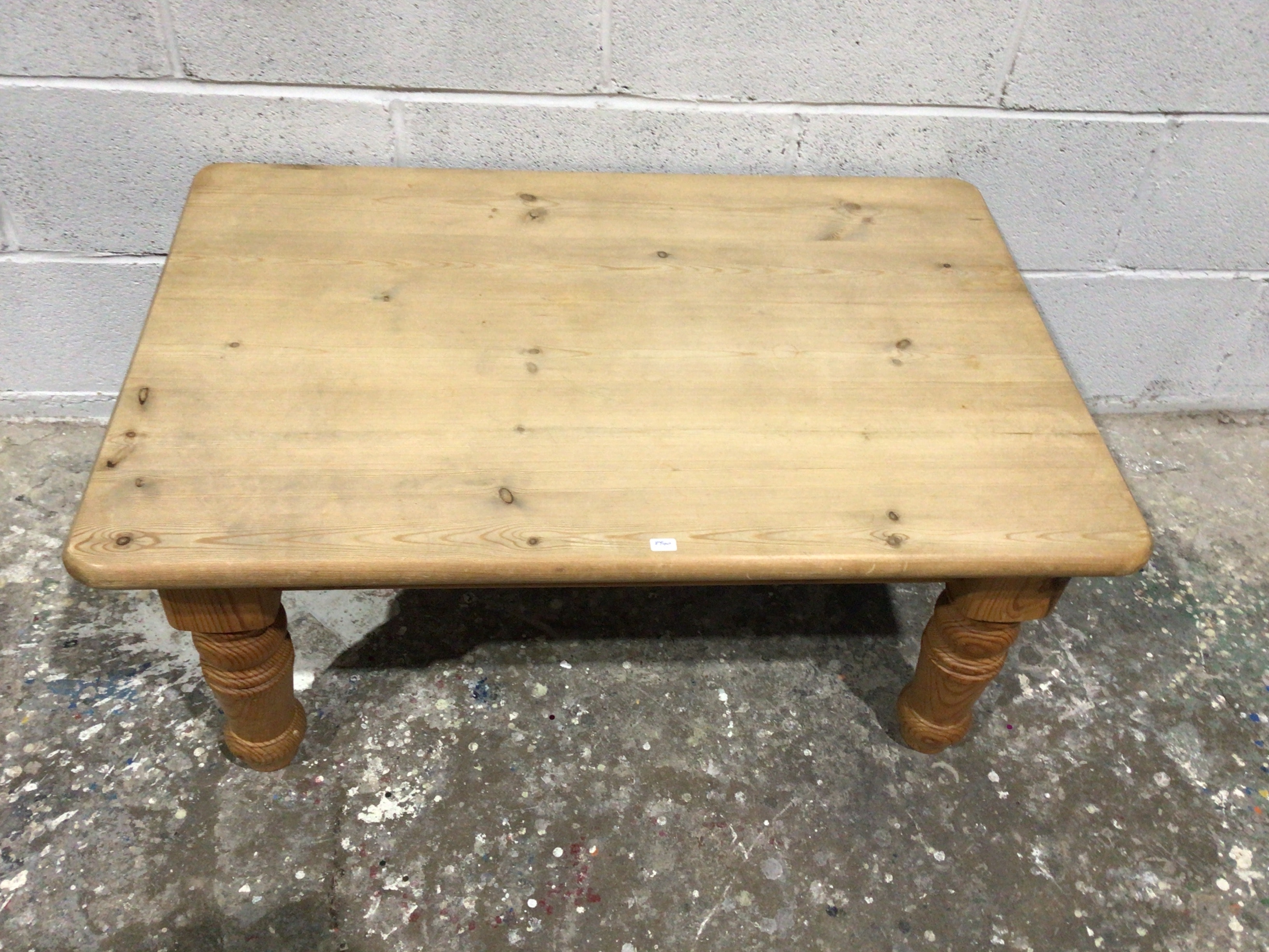 A Pine Farmhouse Coffee Table, circa 1960s. This rectangular wooden table, suitable as a coffee or low side table, is constructed from light-colored softwood, specifically pine, exhibiting distinct grain patterns and numerous knots. It features a planked top with gently rounded edges and four robustly turned legs, embodying a rustic or country-style aesthetic. A small, white adhesive sticker with indecipherable text is present on the tabletop.