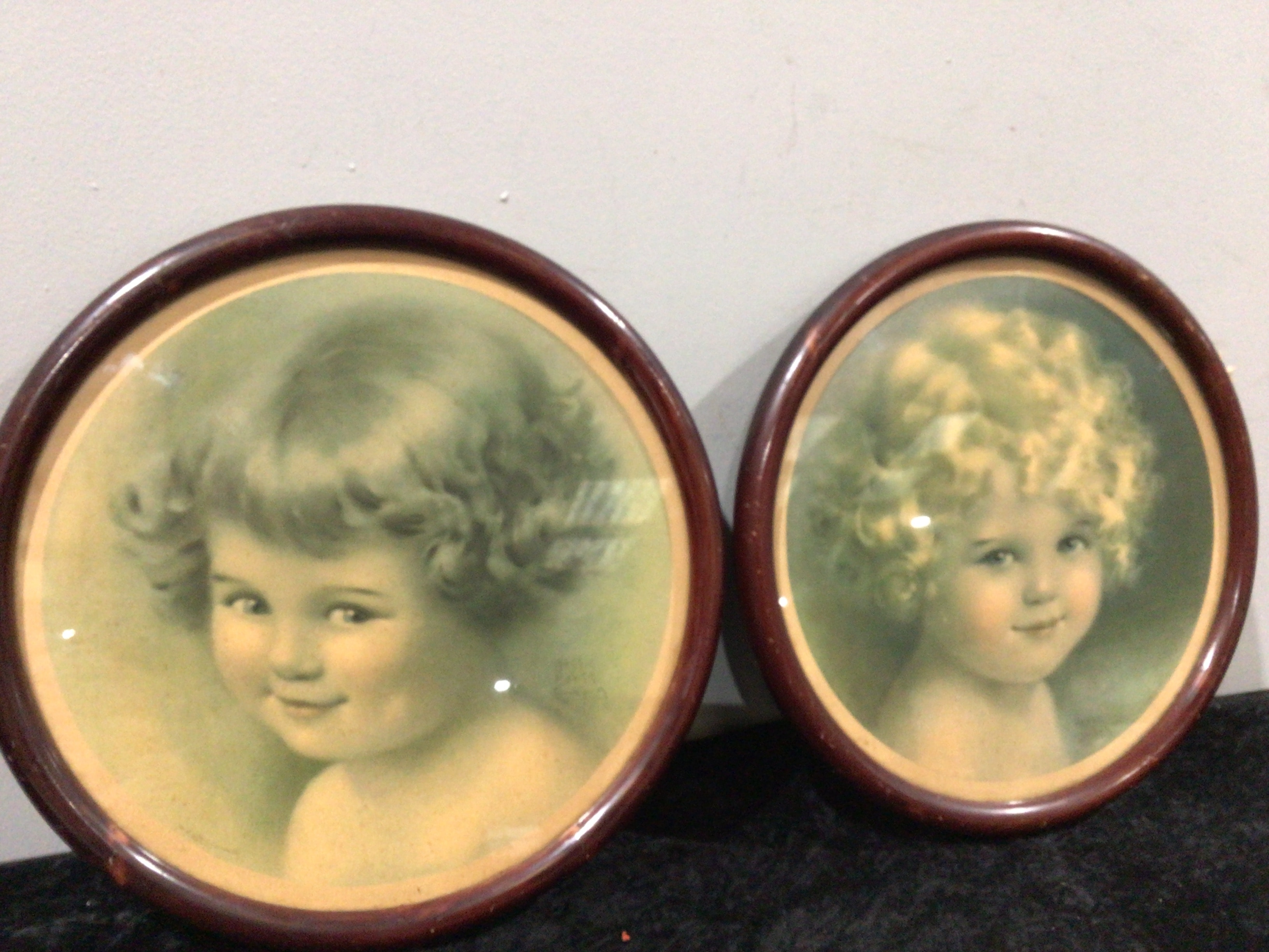 A pair of prints by Bessie Pease Gutmann, titled ‘Mischief’ and ‘Sunbeam’. Each print depicts a smiling young child with curly hair in a sentimental, idealized style. The larger print features a child with darker blonde or light brown curly hair, identified as ‘Mischief’, while the smaller shows a child with lighter blonde, curly hair, identified as ‘Sunbeam’. Each is housed under glass in a dark-stained wooden frame with a lighter-colored inner bezel. Faint, illegible text, possibly a signature or title, is barely discernible on the lower edge of the larger print, with no clear markings visible on the smaller one.