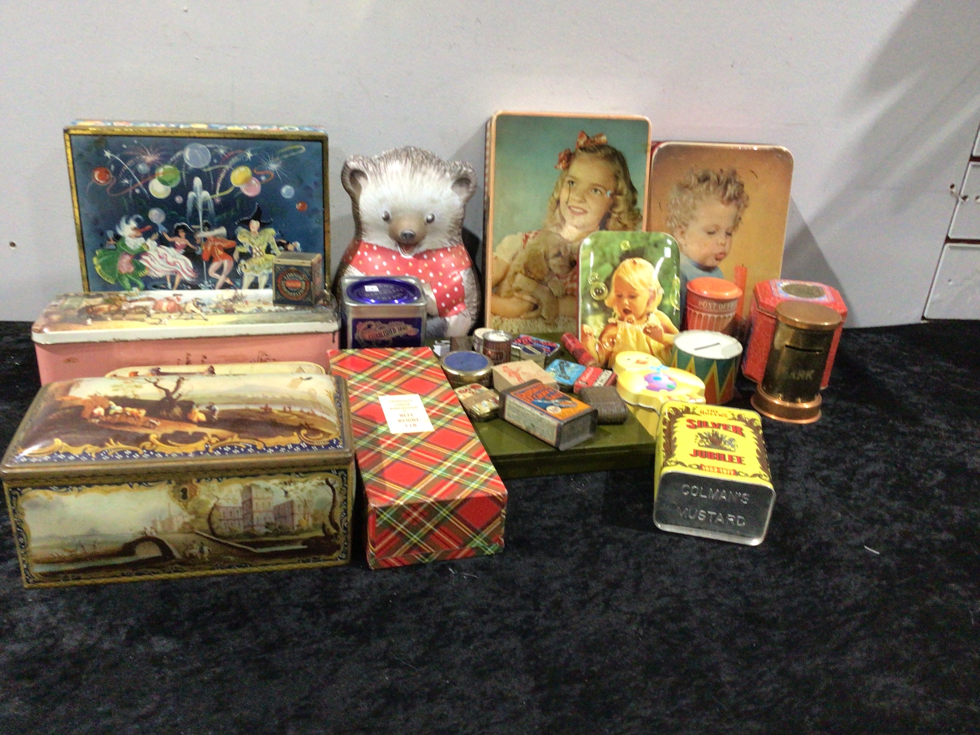 This collection comprises approximately twenty vintage lithographed tinplate boxes and tins, predominantly from the mid-20th century, alongside a single hedgehog figurine. The tinplate items display diverse imagery including idealized portraits of children, festive scenes with fireworks and dancers, and idyllic landscapes featuring bridges and buildings. Notable items include a yellow tin marked “COLMAN’S MUSTARD” and “SILVER JUBILEE, ” a blue tin embossed “ESTABLISHED 1840,” a small tin for “OVALTINE, ” a bronze-colored “BANK” shaped item, and a red plaid box with a label that reads “CHEQUERED LONDON MANCHESTER NETT WEIGHT 1 LB.” The hedgehog figurine is crafted from an unspecified material, likely ceramic or resin, and features a red polka-dot scarf.