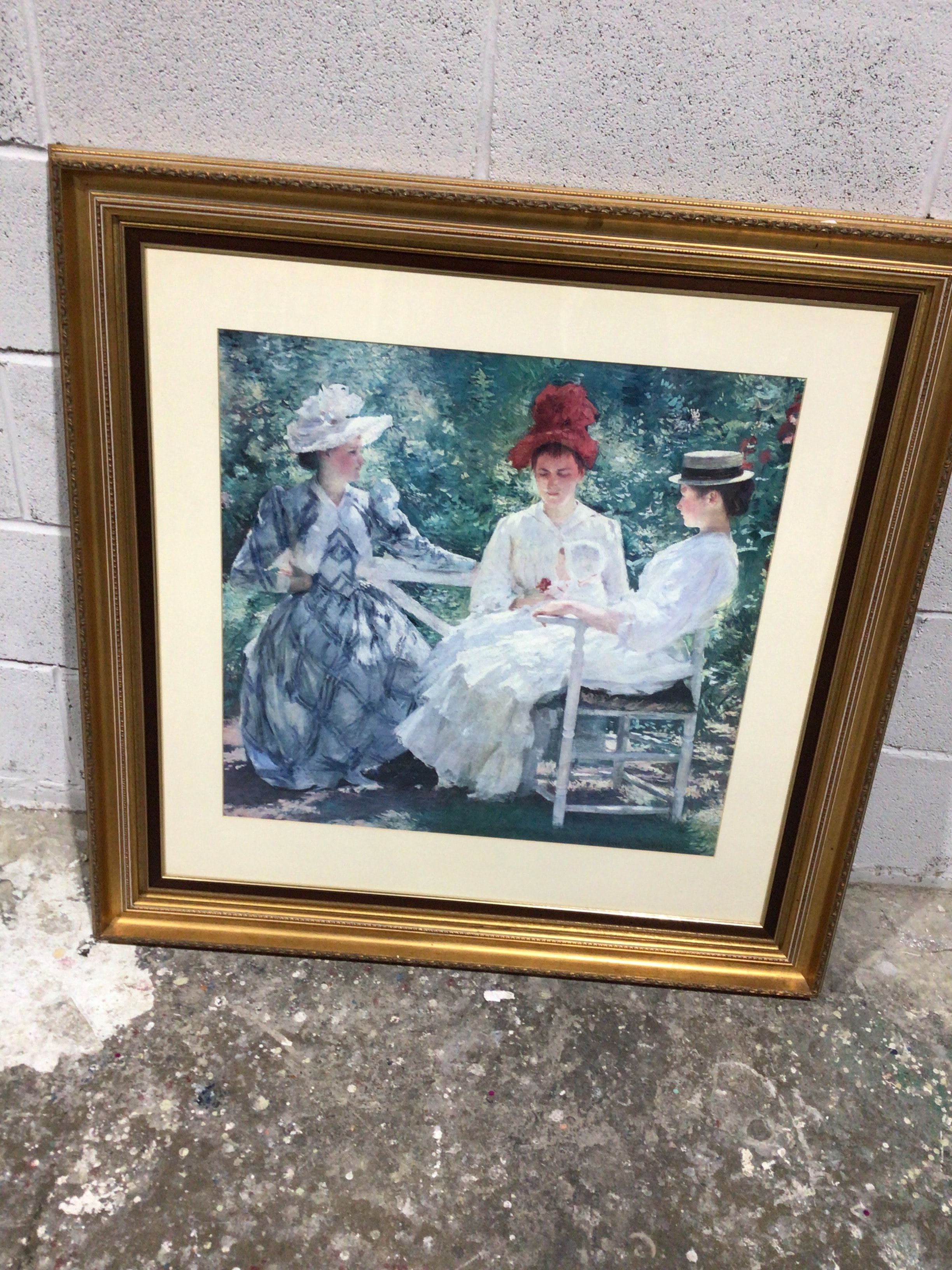 A print after Edmund C. Tarbell’s ‘Three Sisters— A Study in June Sunlight’, circa 1890. This framed print or reproduction, rendered in an Impressionistic style, depicts three women in late 19th to early 20th-century attire within a verdant outdoor setting. The artwork is presented under glazing, framed by a multi-tiered gilt wood or composite frame with decorative molding and a wide, cream-colored mat. No discernible text, signatures, or specific markings are visible on the artwork itself.