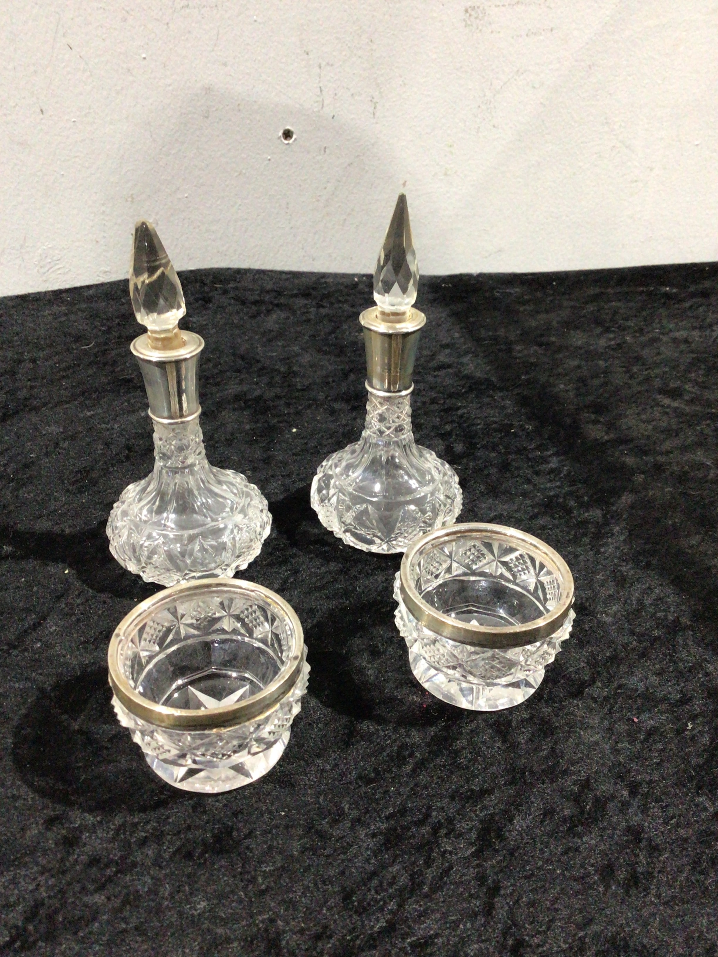 A set of four late 19th to early 20th-century ‘Brilliant Period’ cut glass dressing table articles, comprising two small bottles with faceted stoppers and silver-toned collars, and two open circular bowls with matching geometric cut glass patterns and silver-toned rims. The intricate starbursts and cross-hatching patterns are characteristic of the period. No visible manufacturer’s marks.