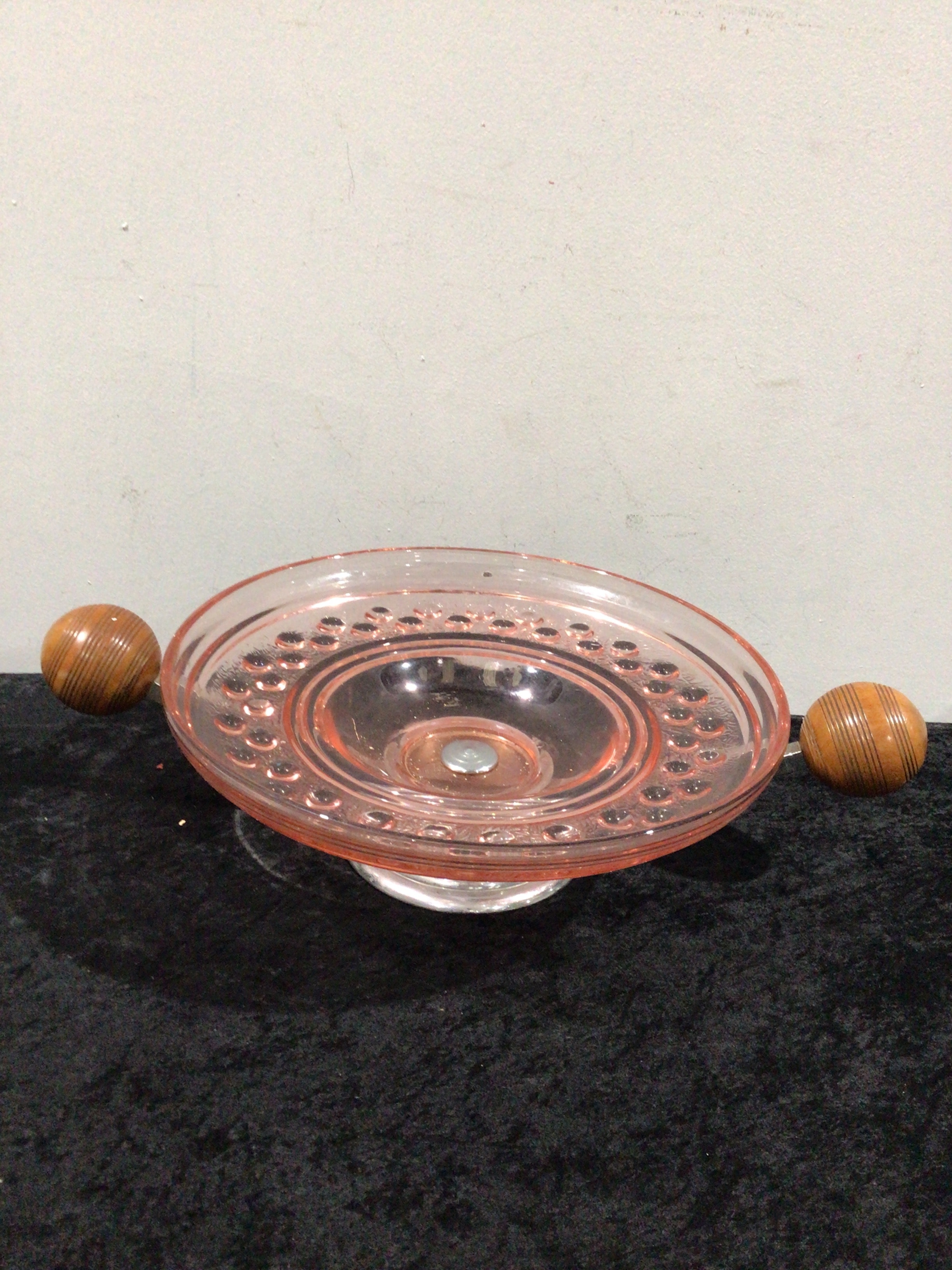A Pink Depression Glass Console Bowl, dating to the circa 1930s. The item features a circular pink pressed glass bowl with a decorative rim embossed with a pattern of small indentations. It is supported by a clear glass footed base. A small silver-toned metal disc is visible at the center of the bowl. Flanking the dish are two spherical, light brown wooden elements, each adorned with dark, linear grooves, appearing to be attached as decorative handles.