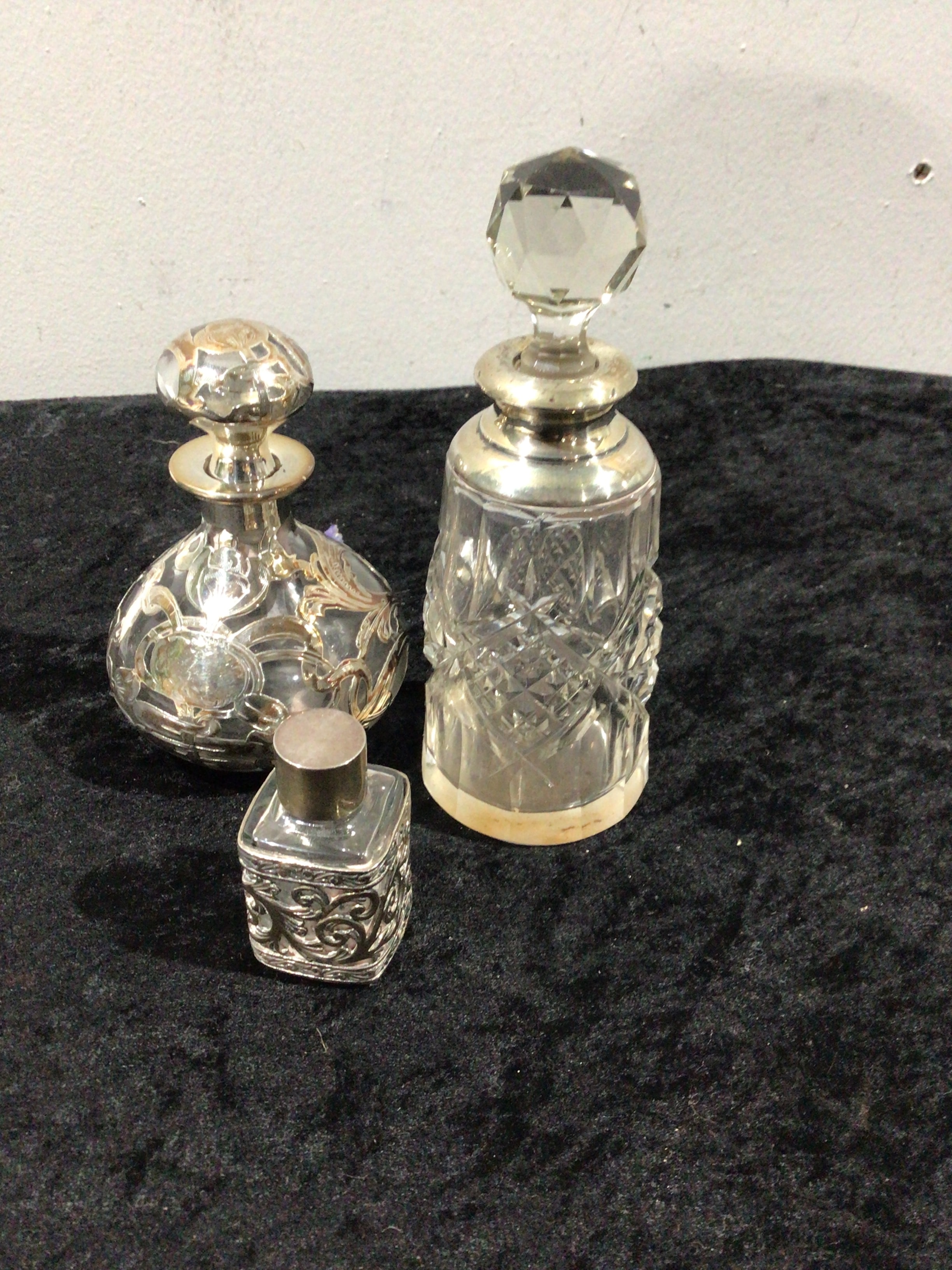 A collection of three antique English sterling silver and cut crystal perfume bottles. The largest bottle features clear, faceted cut crystal with a distinct geometric pattern, topped with a multi-faceted clear glass stopper seated in a silver-toned metal collar. The medium-sized ovoid bottle comprises clear glass encased in an elaborately chased or repoussé silver-toned metal overlay, adorned with floral or foliate motifs, and capped by a matching ornate metal stopper. The smallest square-shaped bottle combines clear glass with a silver-toned metal casing displaying intricate scrollwork in relief, completed with a plain metal cap. While no visible hallmarks are discernible, the design and market comparables suggest sterling silver components.