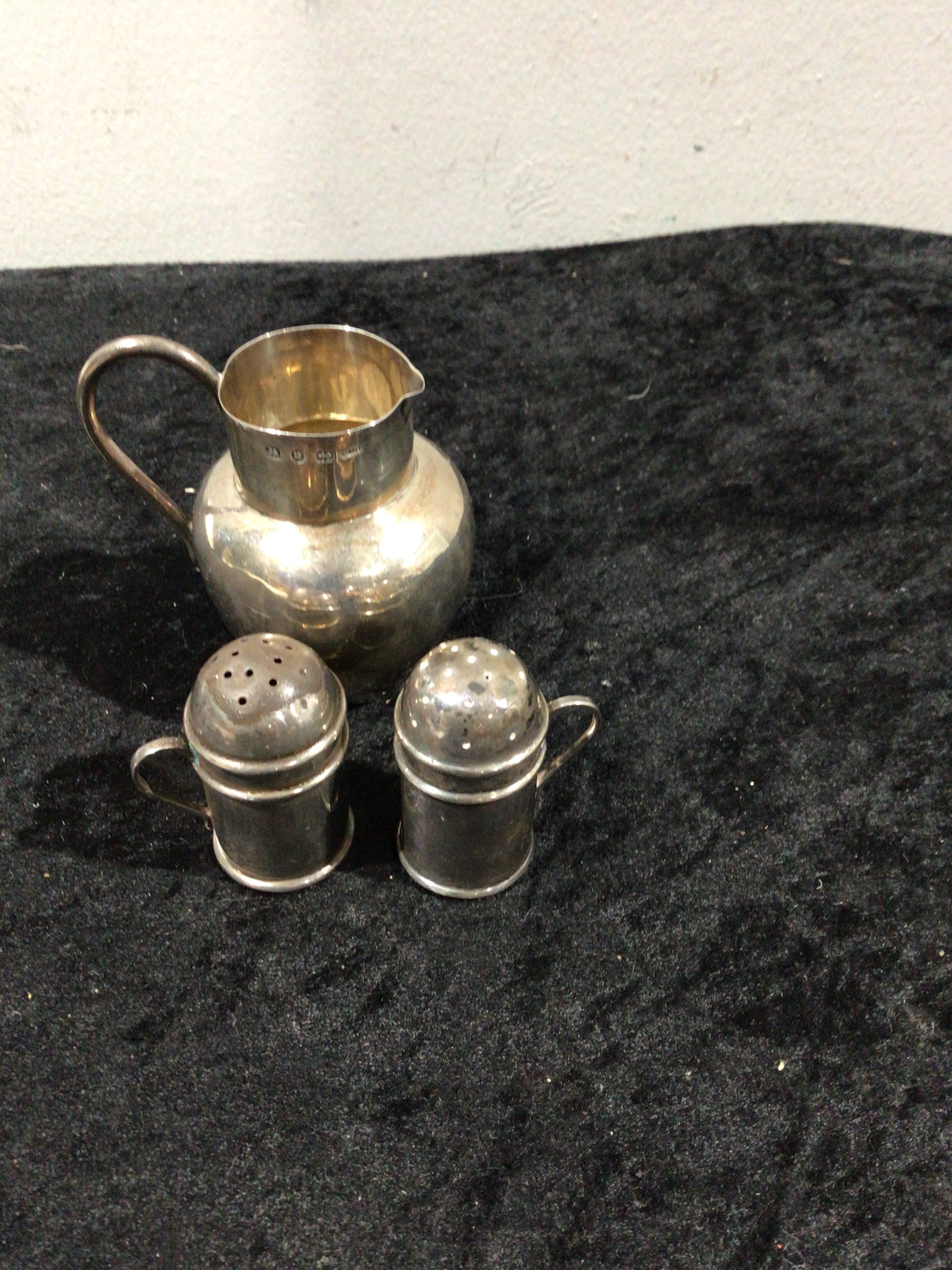 A three-piece English sterling silver tableware set, comprising a small, bulbous creamer or pitcher with a C-scroll handle and pouring spout, accompanied by two identical cylindrical shakers, each with a perforated domed top and small handle. The set displays a simple, unadorned style. Visible hallmarks on the creamer’s rim include a lion passant, a crown, and the maker’s initials ‘GS’, confirming British sterling silver manufacture.